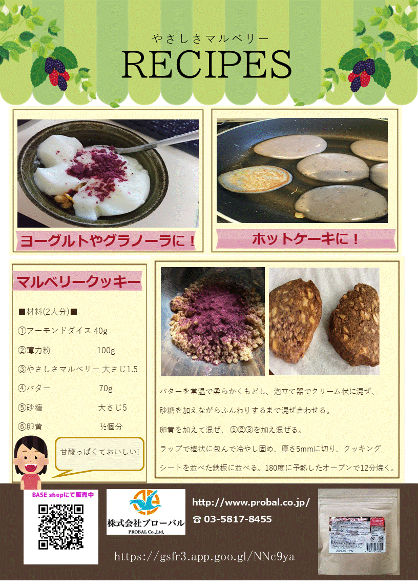 リターンにも入っている桑の実粉末「やさしさマルベリー」のレシピをまとめました。これ以外にもパンに練りこんだり、ケーキに入れたり様々な使い方ができます。AMAZON→https://www.amazon.co.jp/dp/B08143GG5T/ref=cm_sw_r_li_api_i_Bi2ZEbKMBE6GFBASE→ https://gsfr3.app.goo.gl/NNc9yaにて販売もしております。引き続きよろしくお願いします!!