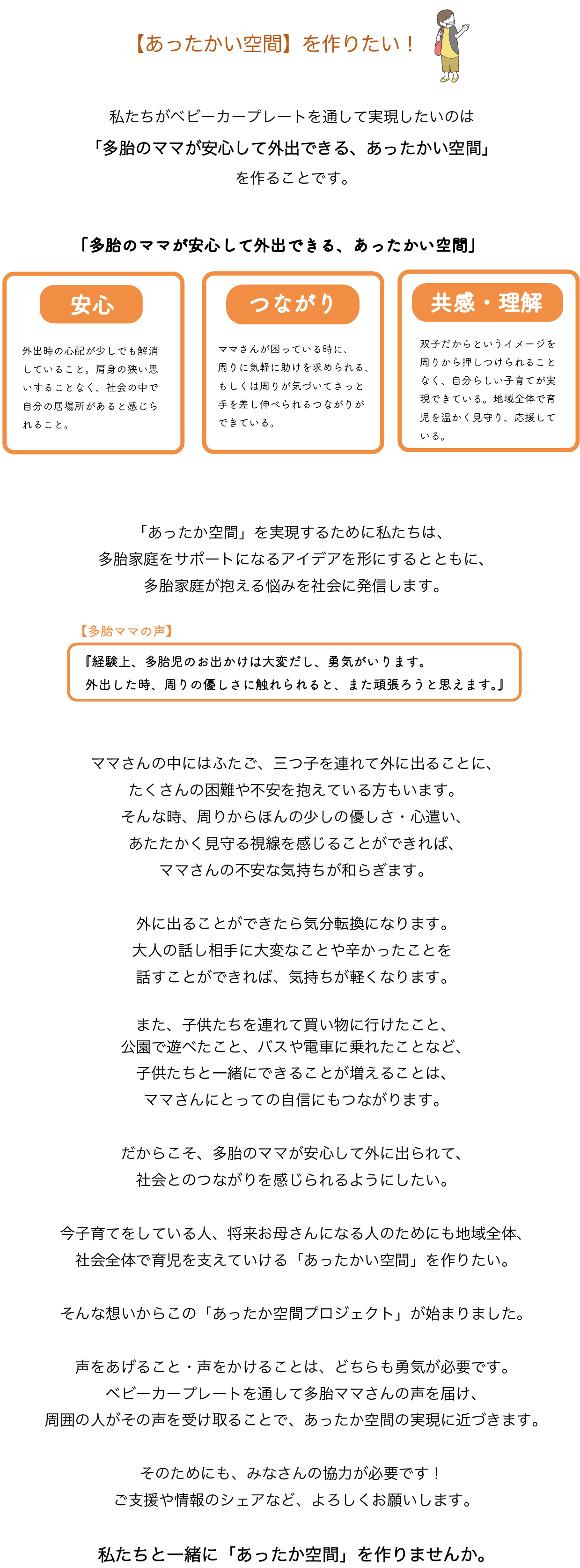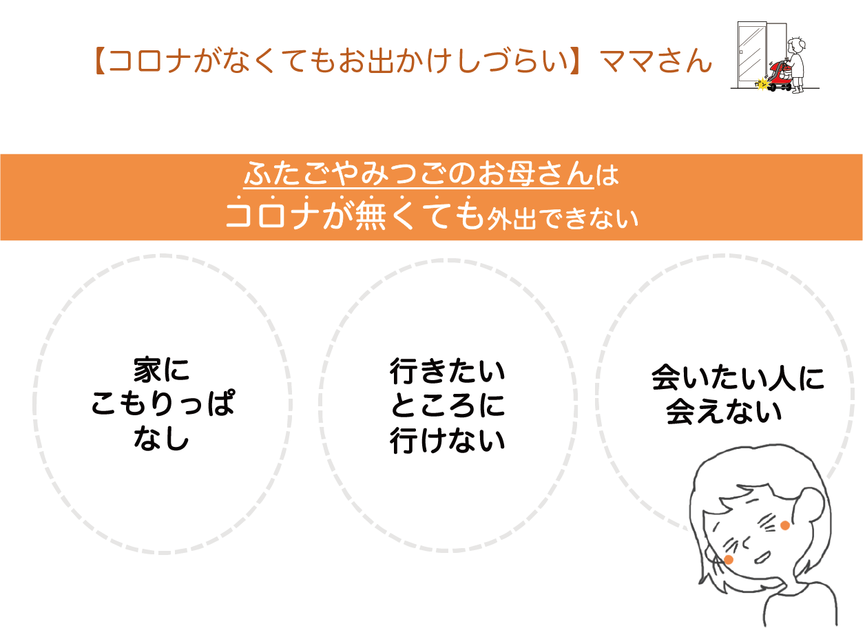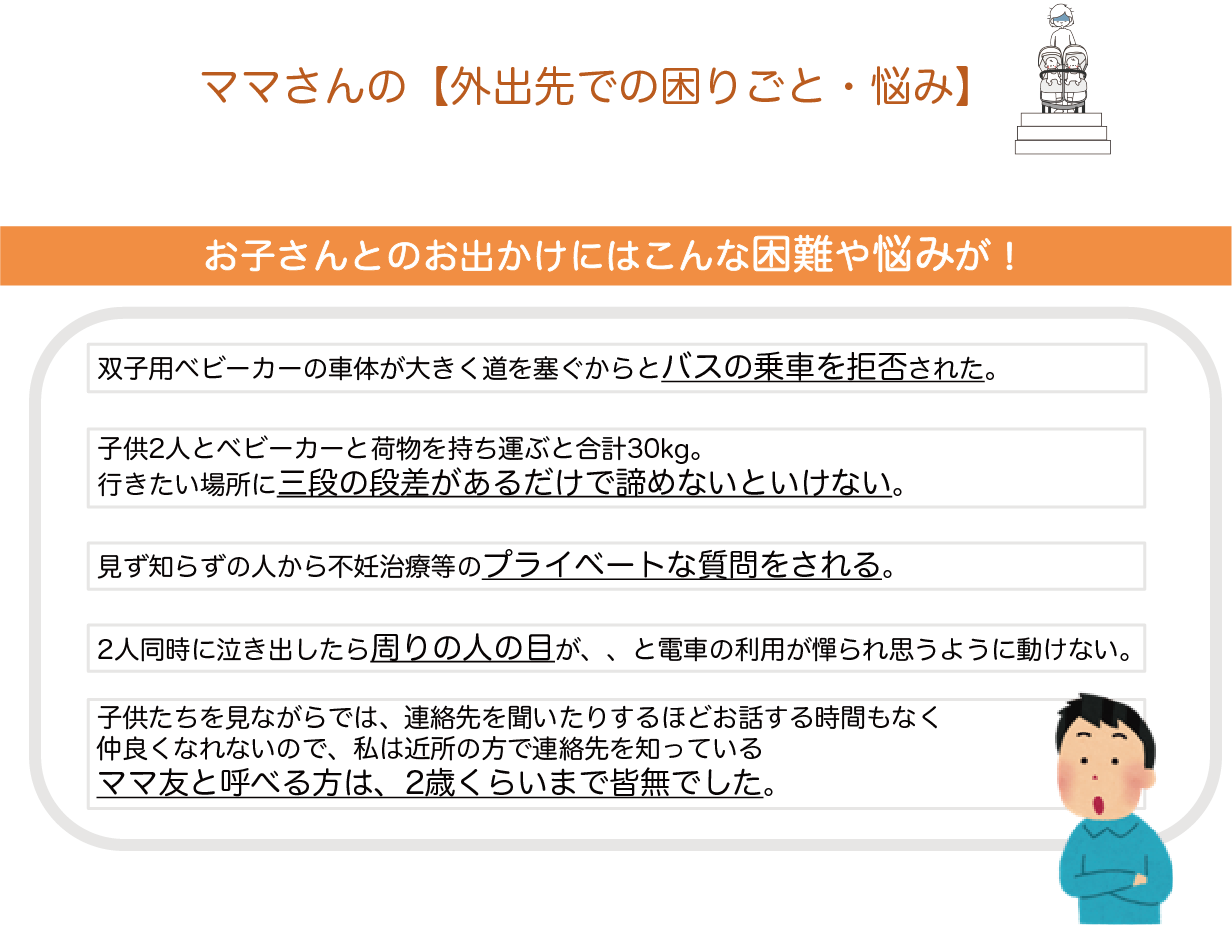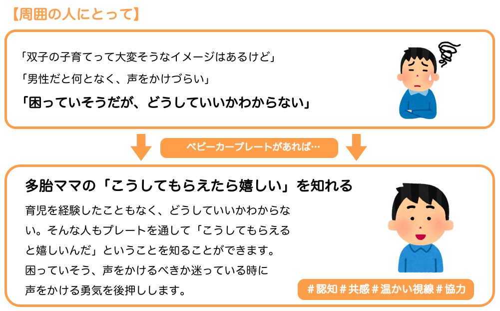 多胎ママさんの「こうしてもらえると嬉しいんだ」「こんなことに困っているんだ」という気持ちを、文字とイラストで表現し、ベビーカーにつけることで、多胎ママさんが外出時に抱える悩みの解消を目指します。