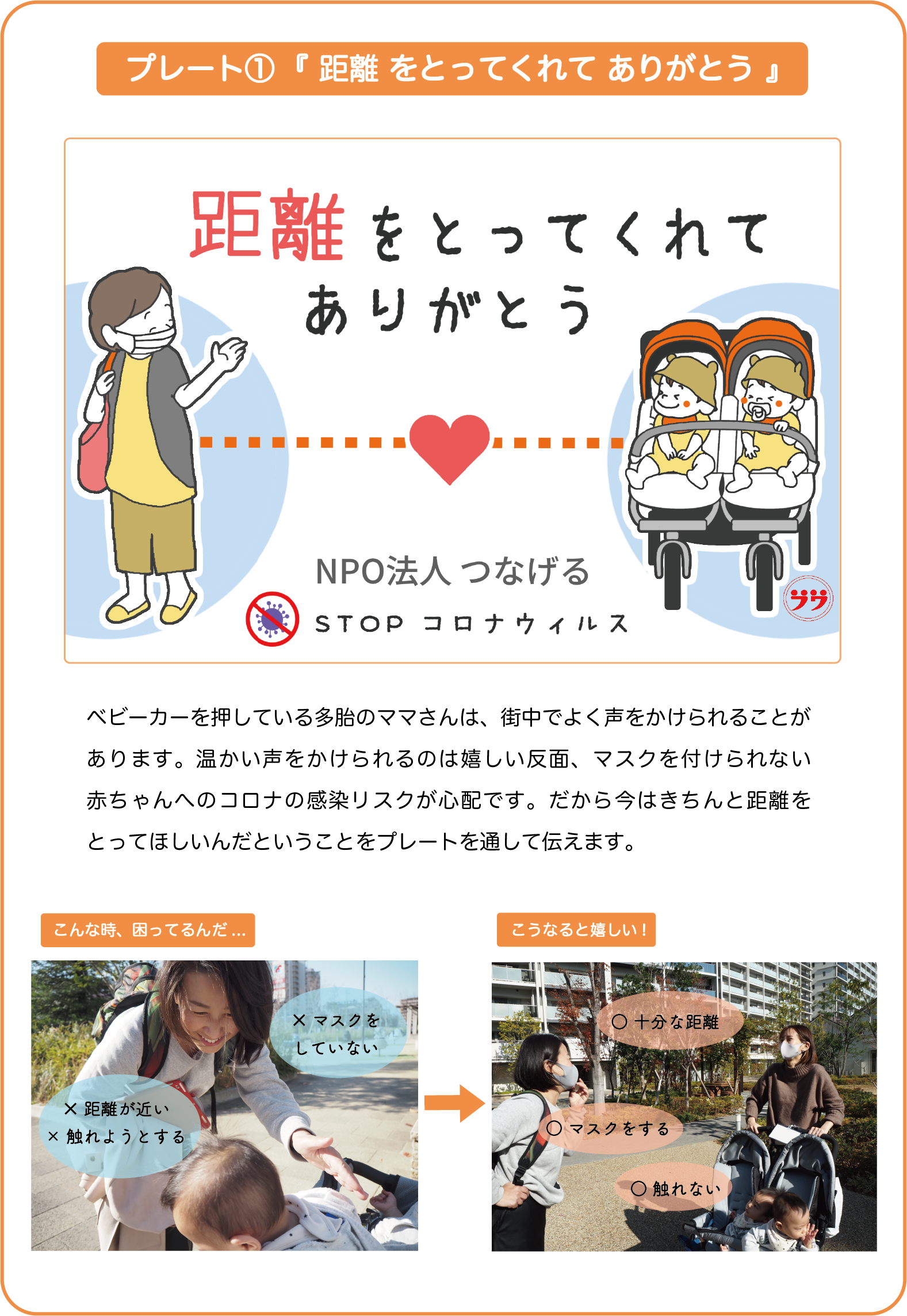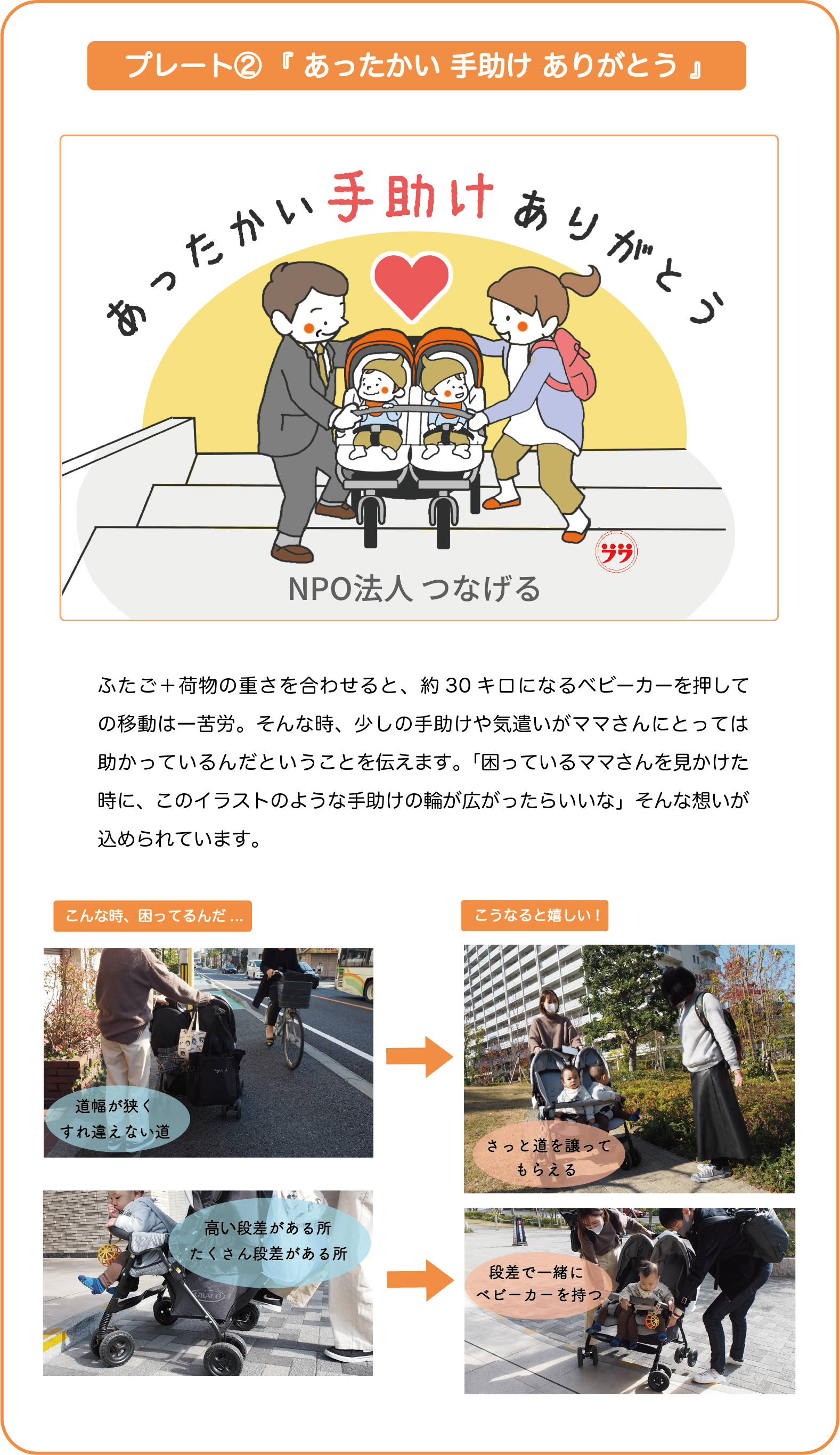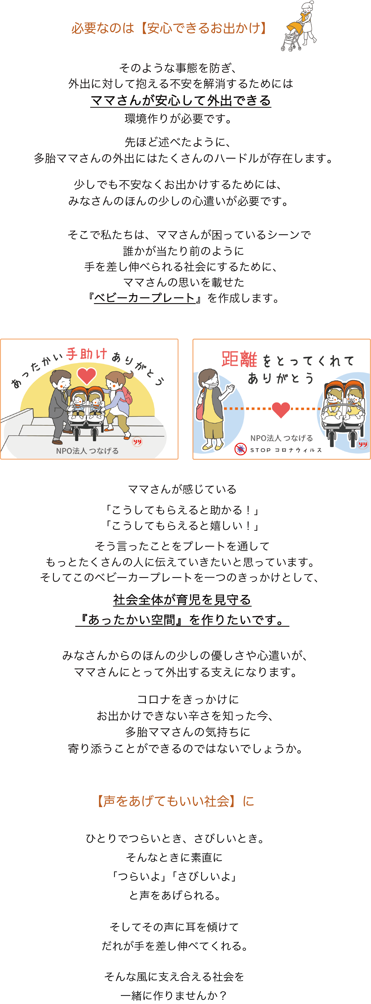 多胎ママさんの「こうしてもらえると嬉しいんだ」「こんなことに困っているんだ」という気持ちを、文字とイラストで表現し、ベビーカーにつけることで、多胎ママさんが外出時に抱える悩みの解消を目指します。
