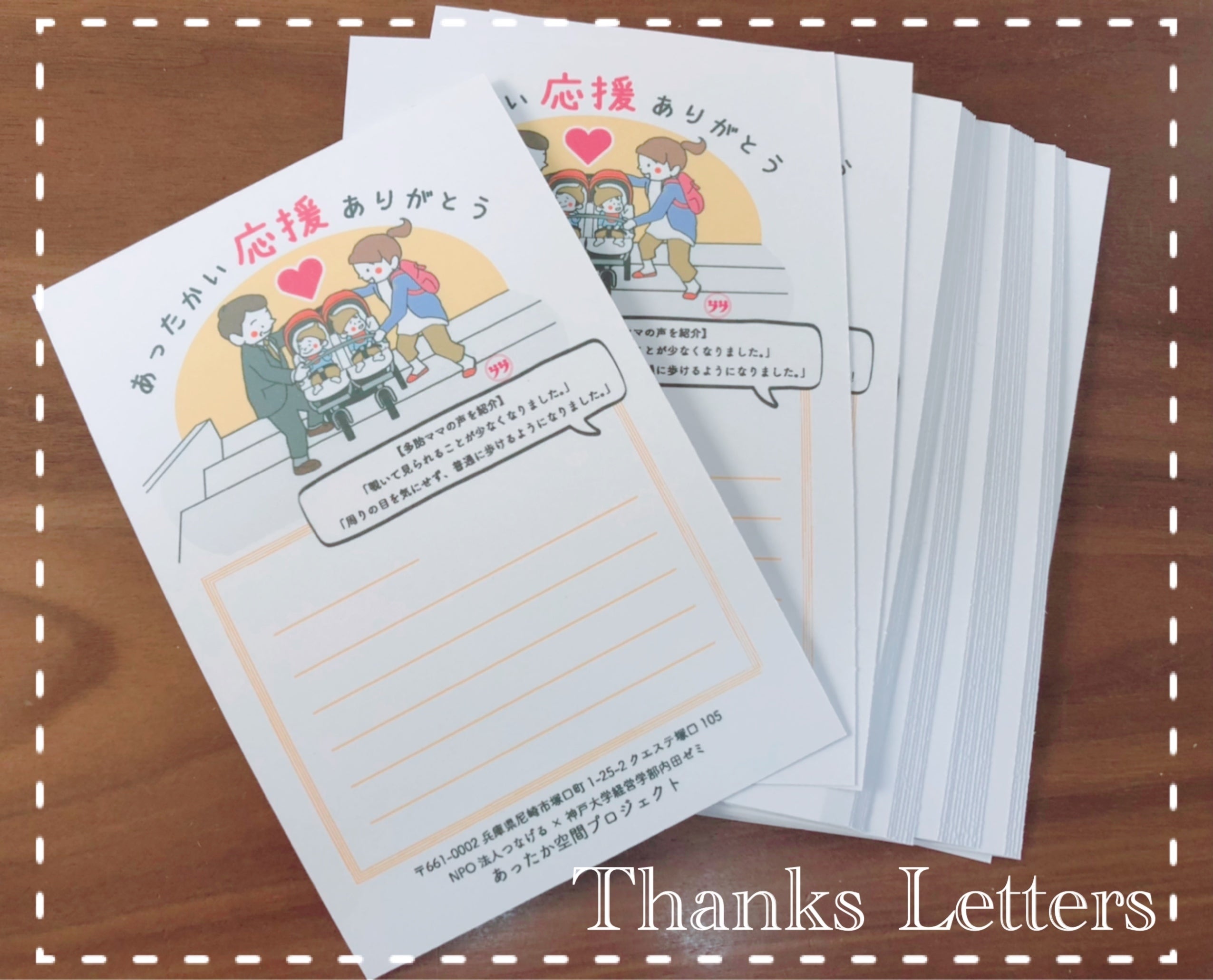 2021/05/28 15:00こんにちは、あったか空間プロジェクトです。久しぶりの更新になりましたが、今回は4月、5月の活動報告として2つあります。1つはリターンについて。大変遅くなってしまいましたが、4月末に支援してくださった皆様へのリターンとして、サンクスレターをお送りしました。感謝の気持ちを込めて、一人一人丁寧に手書きでメッセージを書いております。改めて、応援・支援してくださったみなさま、ありがとうございます。またもし、支援したが手紙が届いていないという方がおられましたら、お手数おかけしますが、メッセージやメールなどで教えてください。2点目はベビーカープレートアンケートについて。多胎家庭の皆様にベビーカープレートをお届けして2ヶ月ほどが経ちましたが、お出かけでの変化はありましたか?アンケートを通して、是非皆さんの感想やご意見を教えてください。ご協力、よろしくお願いいたします。【ベビーカープレートに関するアンケートURL】https://docs.google.com/forms/d/e/1FAIpQLScNWoailTap_5YNe4RtxdnVK6u8fN5R88n4sbx7vfB00KdCJA/viewform【アンケート回答期間】2021/6/6(日)まで もっと見る