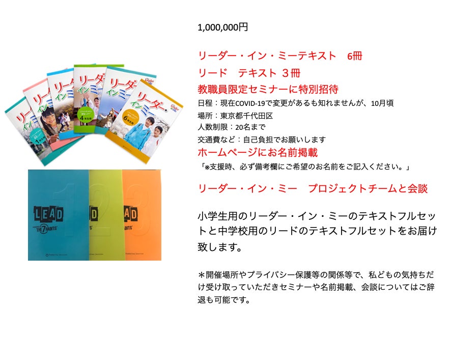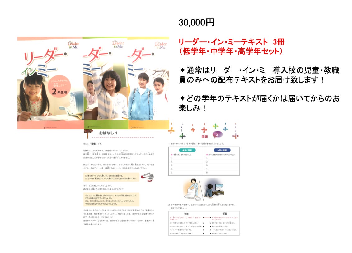 しかし、日本では、公立小中学校における教育資金の不足によりこの6年間で全国31校(2020年4月現在)に留まり、「リーダー・イン・ミー」を導入できずに待機している学校、継続ができない学校があります。そうした学校への援助金として使わせていただきます。