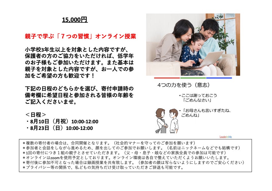 そのため、「リーダー・イン・ミー」の開発にあたるフランクリン・コヴィー・エデュケーションとともに、家庭で保護者と一緒にオンラインで「リーダー・イン・ミー」が学習できる開発を行っております。子どもと一緒に動画やイラストストーリー、ワークシート、アクティビティなどができるコンテンツを開発し、一人でも多くの子どもたちに「リーダー・イン・ミー」をお届けする費用に使わせていただきます。