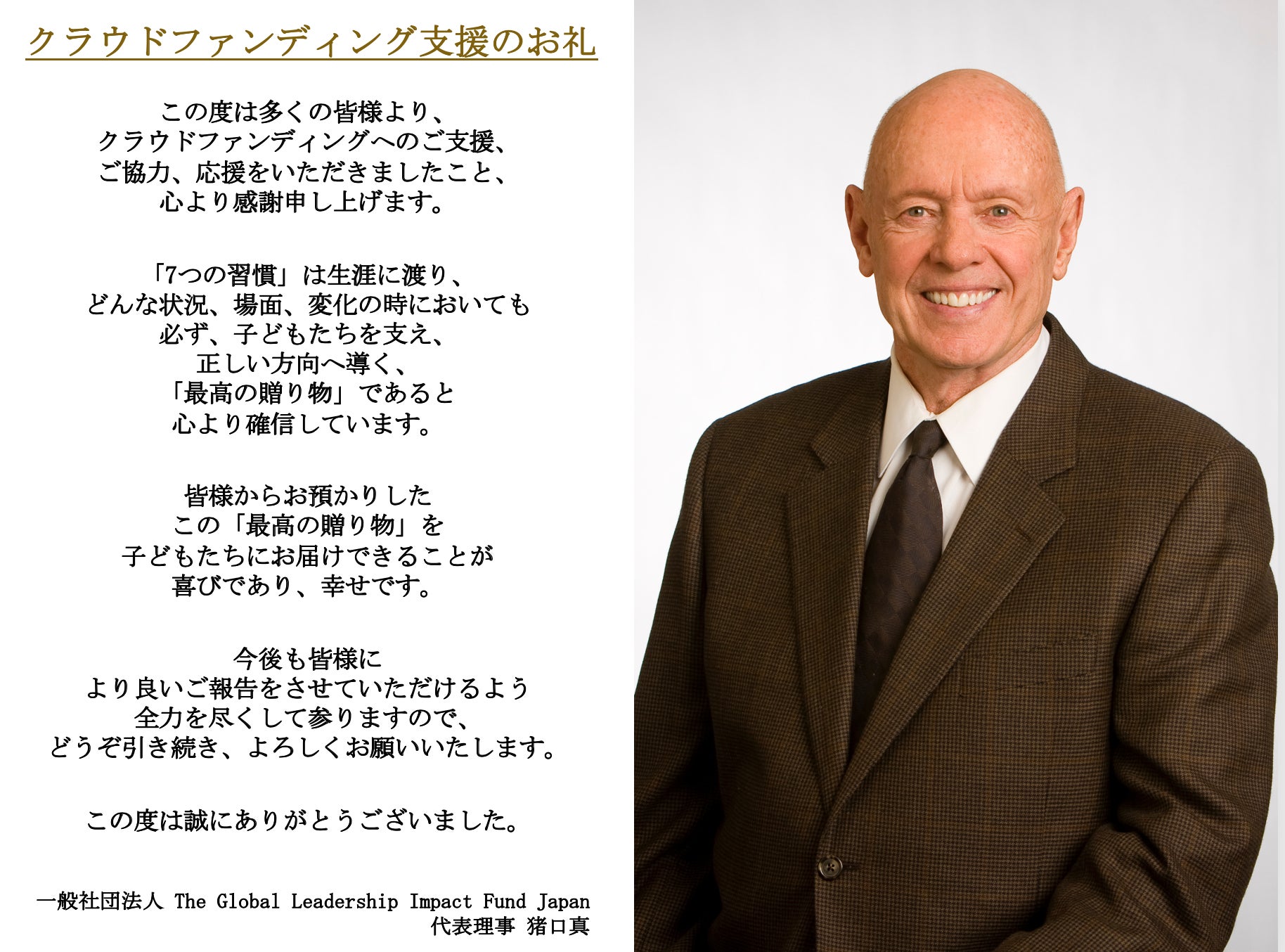 2020/06/28 12:01この度は、たくさんの暖かいお言葉、励ましのお言葉とともに想いの込もったご支援いただきましたこと、心より感謝申し上げます。誠にありがとうございます。いつの時代も、子どもたちは、私たちの「宝」であり、一人一人がもって生まれた才能は、他に変えることのできない「財産」です。そうした希望に満ちた子どもたちが、心身ともに豊かに健やかに育つことは、私たちの切なる願いであり、社会に幸せと元気を与えてくれることとなります。今回、ご支援をいただだきました皆様によって、子どもたちの新たな可能性が解き放たれることはもちろんのこと、ご支援をしてくださった皆様自身が「流れを変える人」となり、子どもたちに「リーダー・イン・ミー」「7つの習慣」を学べる機会を与えてくださったことは、これから続く何世代もの人々に、大きな影響を与え続けることになると確信しています。素晴らしい変化の1ページをありがとうございます。これからの子どもたちや学校の変化を、引き続き、FacebookやTwitterなどでもご報告させていただきますので、一緒に成長を見守り、応援していただけましたら幸いです。皆様とクラウドファンディングを通し、ご縁をいただけましたことを心より嬉しく、改めて感謝申し上げます。時節柄、どうぞ体調管理には十分お気をつけいただきますように。皆様のご健康とご多幸を心よりお祈りしております。この度は誠にありがとうございました。一般社団法人 The Global Leadership Impact Fund Japan代表理事 猪口 真 もっと見る