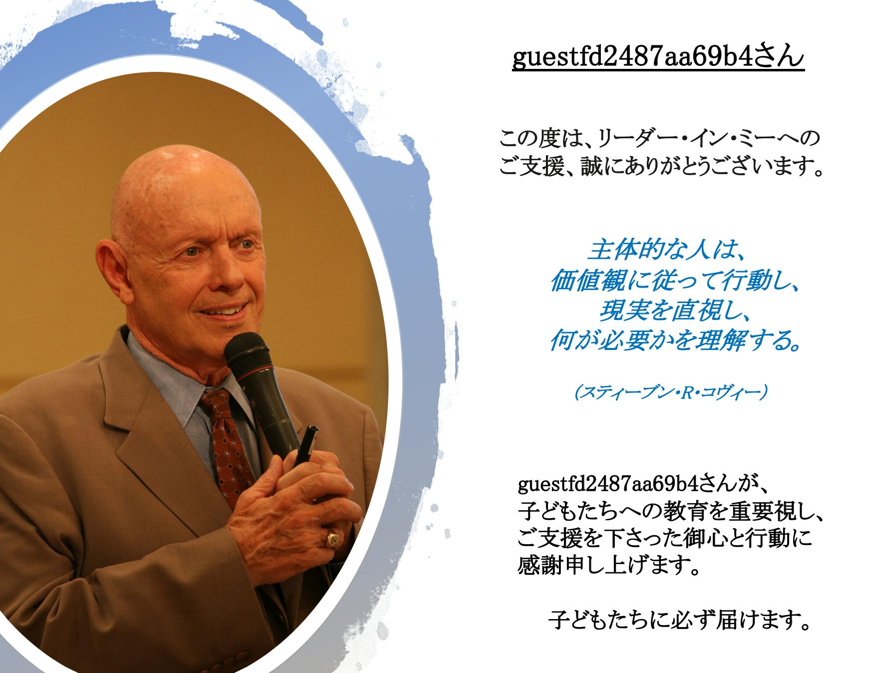 この度はリーダー・イン・ミーへのクラウドファンディングのご支援、誠にありがとうございます。心よりお礼を申し上げます。guestfd2487aa69b4さんさんの想いを、しっかりと子どもたちへの支援として届けさせていただきます。