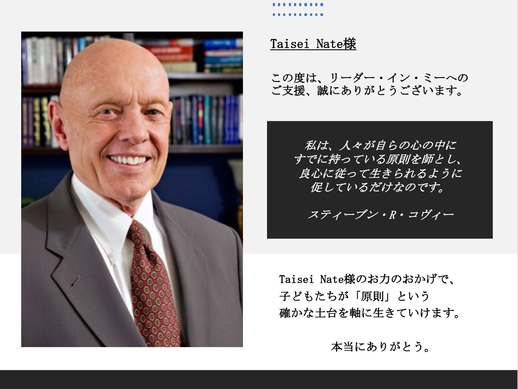 この度はリーダー・イン・ミーへのクラウドファンディングのご支援、誠にありがとうございます。心よりお礼を申し上げます。Taisei Nateさんの想いを、しっかりと子どもたちへの支援として届けさせていただきます。