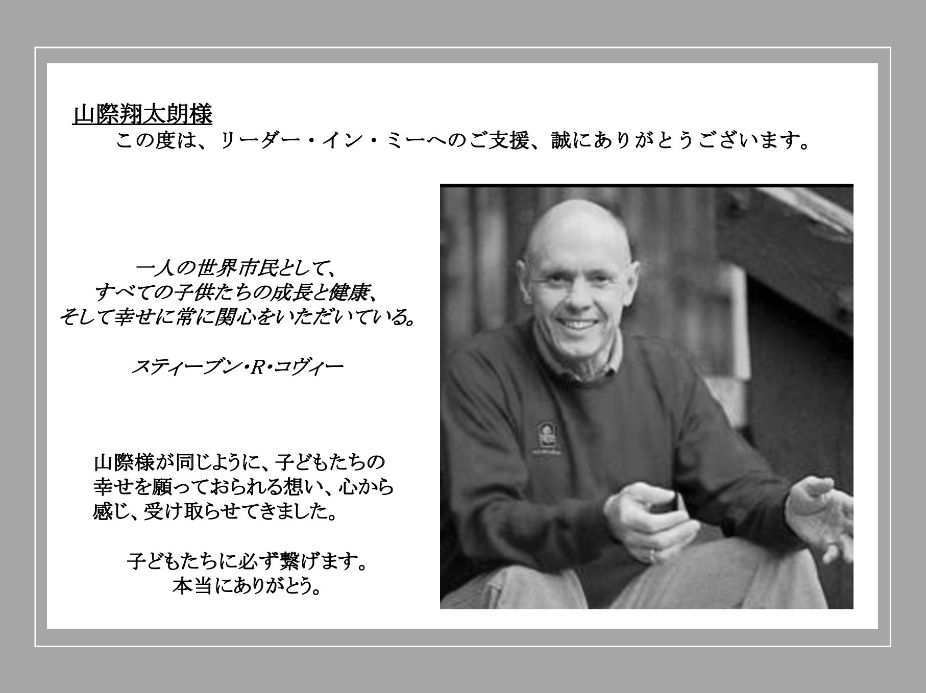 山際翔太朗さんこの度はリーダー・イン・ミーへのクラウドファンディングのご支援、誠にありがとうございます。心よりお礼を申し上げます。山際さんの想いを、しっかりと子どもたちへの支援として届けさせていただきます。引き続き、どうぞよろしくお願い申し上げます。事務局より心を込めて(返信は一般社団法人The Global Leadership Impact Fund Japanからであり、コヴィー博士本人ではないことをご了承くださいませ。)