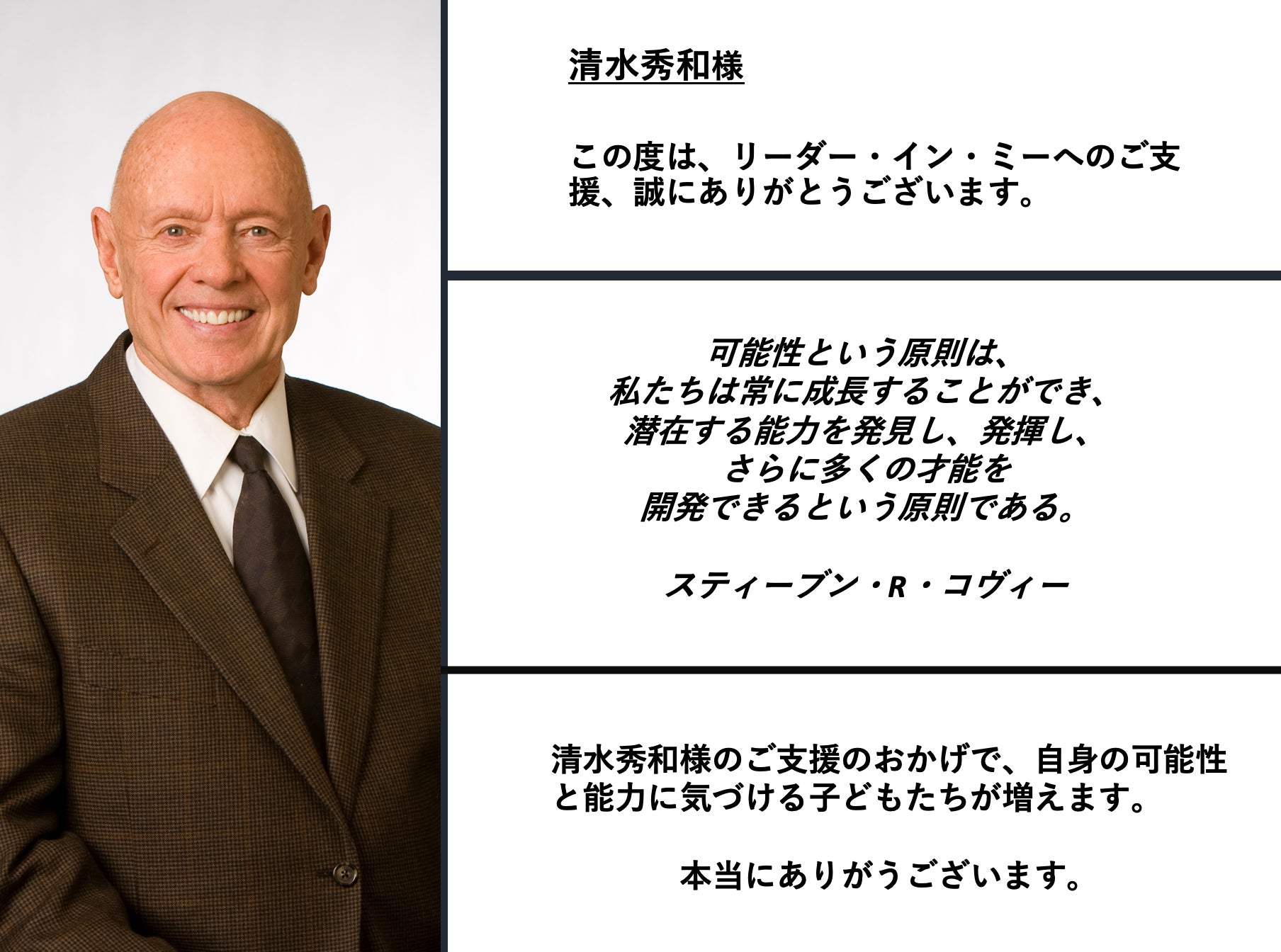 清水秀和さんこの度はリーダー・イン・ミーへのクラウドファンディングのご支援、誠にありがとうございます。心よりお礼を申し上げます。清水秀和さんの想いを、しっかりと子どもたちへの支援として届けさせていただきます。引き続き、どうぞよろしくお願い申し上げます。事務局より心を込めて(返信は一般社団法人The Global Leadership Impact Fund Japanからであり、コヴィー博士本人ではないことをご了承くださいませ。)