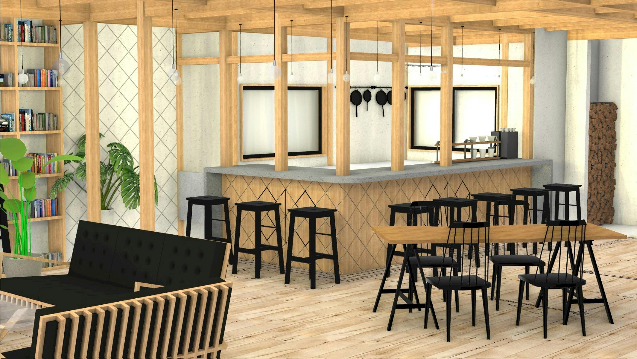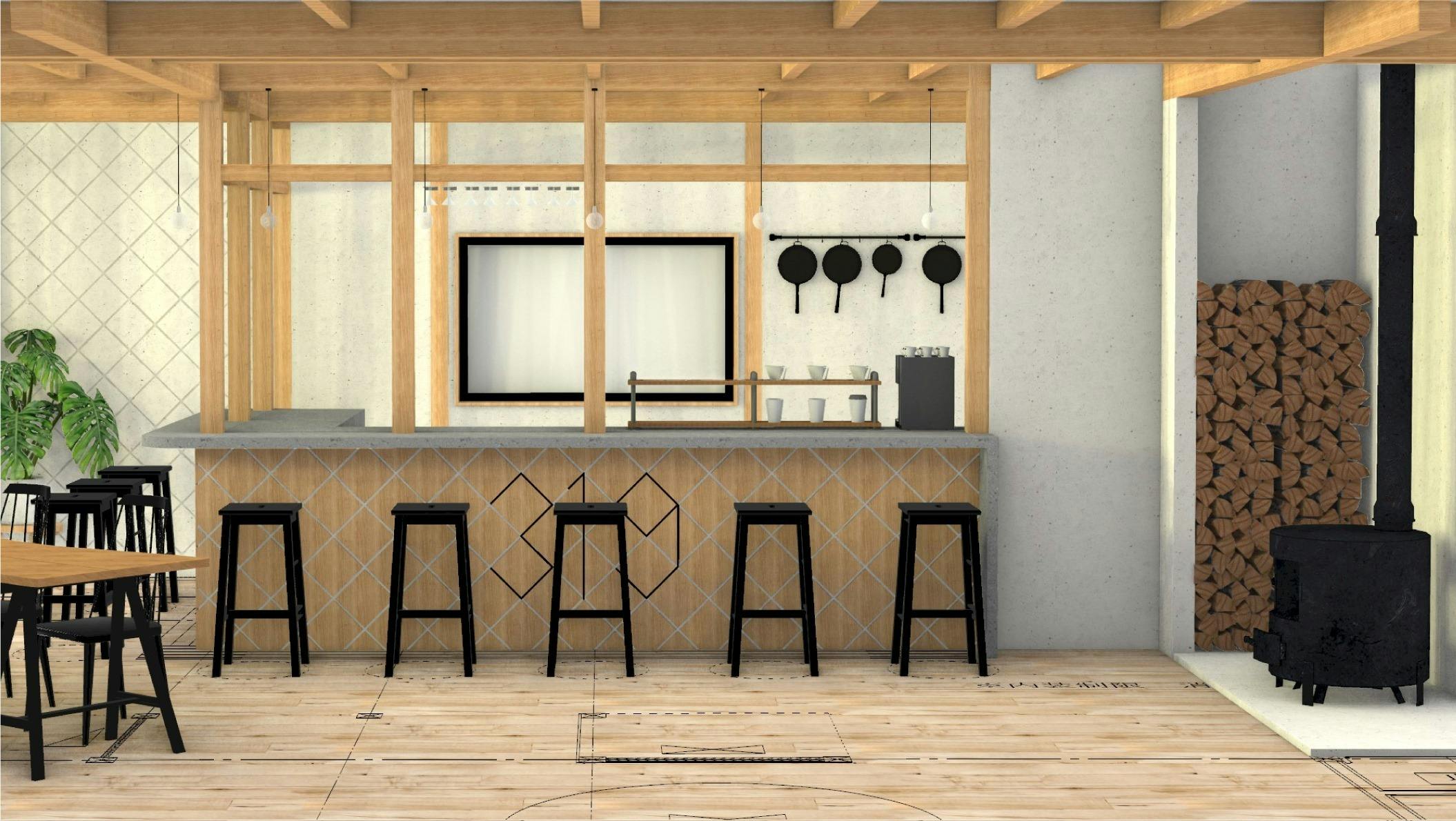 BARカウンター、カフェキッチンをつくって、みんなが集まれる憩いの場としての機能を作りたい!