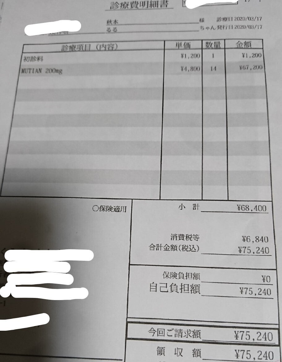 MUTIAN250mg¥6600(税込)×残り70日=¥462000