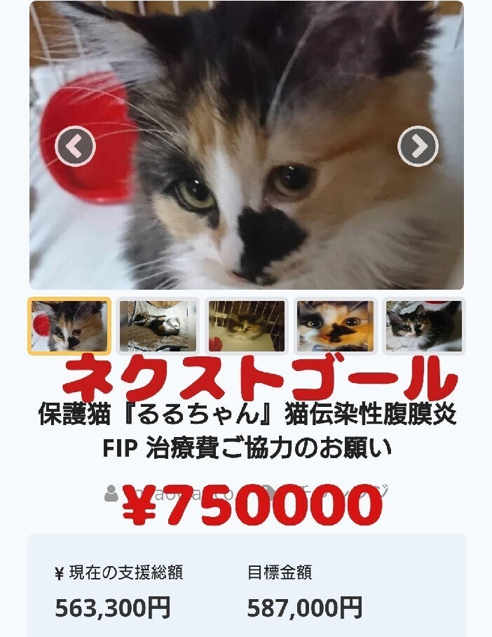 2020/04/14 22:42『るるちゃん』をいつも応援して下さり本当にありがとうございます。本日、かかりつけ医から電話がありました。炎症反応の結果、かなりの数値があがっているとの事でした。『るるちゃん』はFIPウエットタイプ発症でしたが、ドライタイプとの混合になっている可能性が高いと。だから元気が無かった。玩具にも反応しなかった。身体がしんどかったんだと思います。ウエットとドライが混合になった場合は今飲んでいる薬MUTIANの1.5倍増量。『るるちゃん』の体重が2.1㌔なので追加100mg、MUTIAN350mgを本日から服用するようになりました。追加分のお薬が100mg¥2640(税込)これを残り56日間飲まなければFIPは治らない。1日¥9240がかかるようになってしまいました。最初の設定に追加をさせて頂きネクストゴールを¥741000にさせて頂きたいと思います。どうしても17%の手数料がかかってしまうのでこの金額になります。ご飯を食べて生きようとがんばっている『るるちゃん』もう1度元気になって皆と遊ばせてあげたい。安楽死を告げられ、今こうして生きてる今を繋げさせて下さい。人間が大変な時に申し訳ありません。小さな命。『るるちゃん』を助けて下さい。お願いばかりで本当に申し訳ありません。今、ある薬で量を調整し足りない薬は来週頂きに行ってまいります。『るるちゃん』の様子をまた報告させ頂きます。 もっと見る