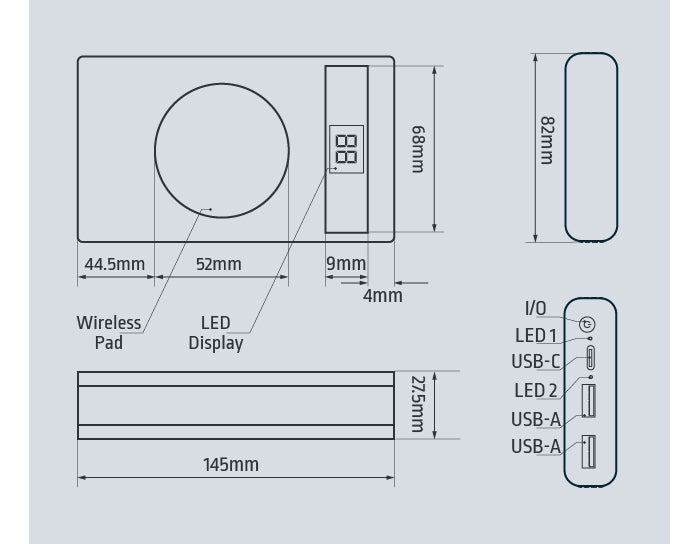フラッシュには電源ボタンが付いており、押すとすべてのポートとワイヤレスパッドから16秒間電源が出力されます。 ポート用の白いLED表示は継続的に点灯します。ワイヤレスパッド用の青いLED表示が点滅し始めます。 この時間内に端末が3つのポートのいずれかに接続されている場合、電源が使用されていることを示す白いLED表示が点灯したままになります。端末がワイヤレス充電パッドに接続されている場合、青いLED表示が点滅します。
