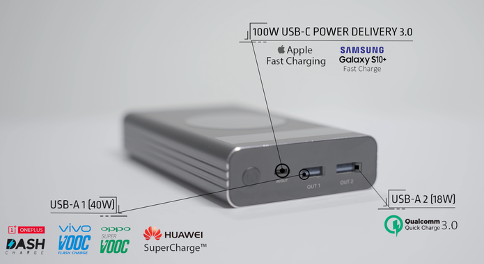 『Flash (フラッシュ)』は、高速充電技術の2つの国際標準であるUSB Type-C 100W Power Delivery 3.0とQualcomm Quick Charge 3.0に対応するのみにとどまらず、Androidユーザーを念頭に置いて特別に設計されたUSB Type-Aポートを含めました。 さらには、Huawei Super Charge(22.5W)、Oppo&Oneplus VOOC Flash Charge / SVOOC Super Flash充電40WおよびVivo VOOCにも対応しています。