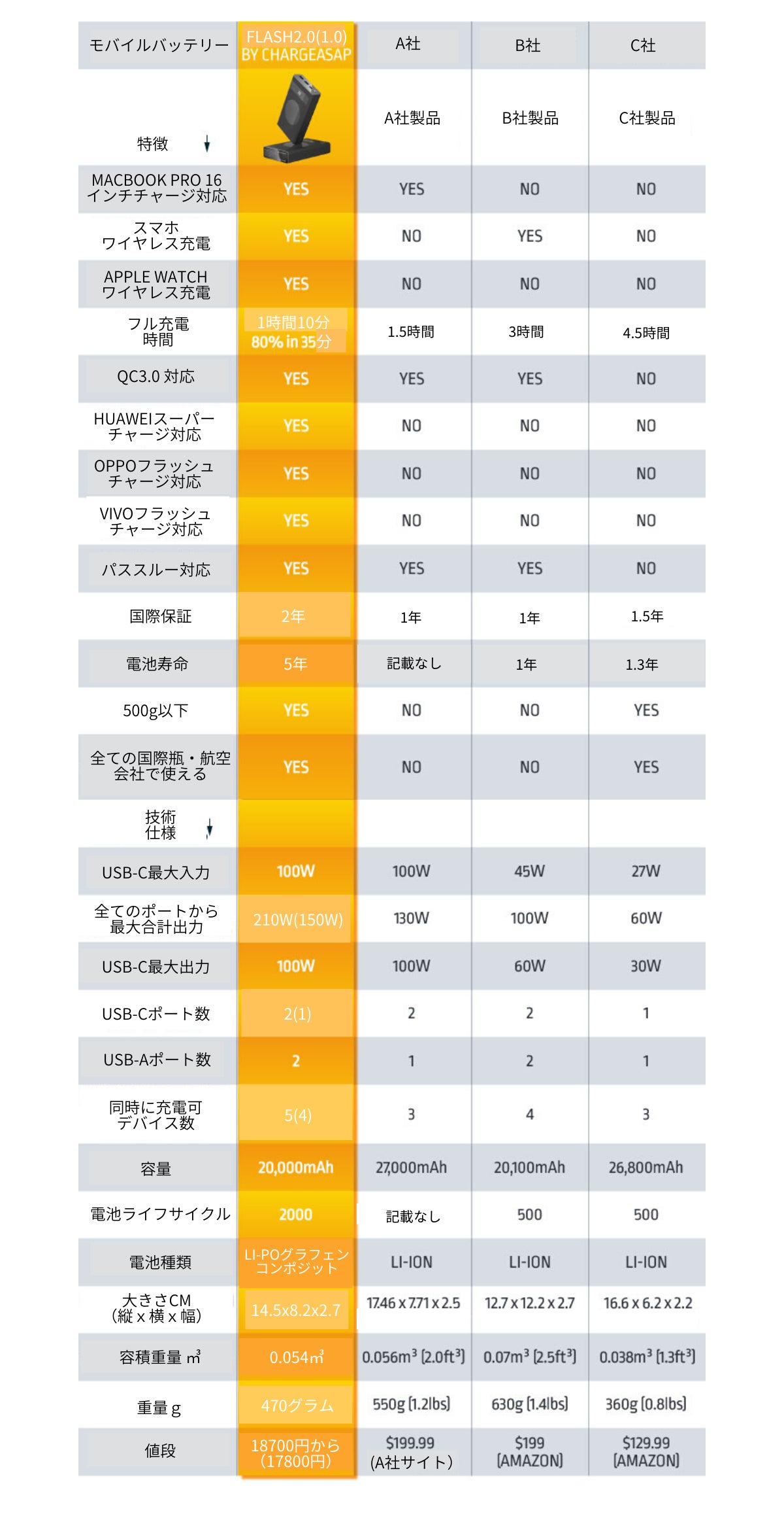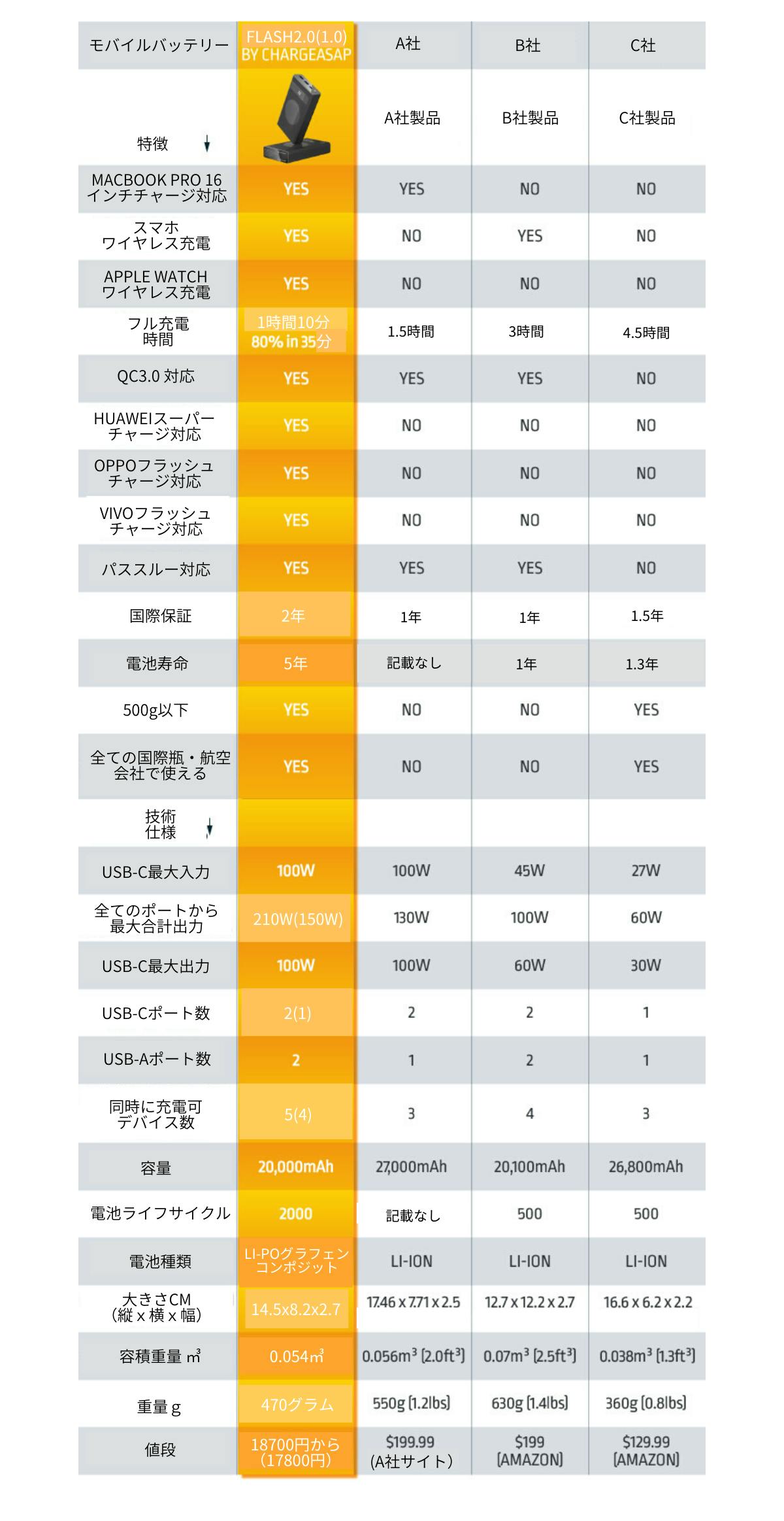 市場に出回っているほとんどすべてのUSB Type-Cのモバイルバッテリーは、バッテリー容量が少ないもしくはUSB Type-c供給電力が最大60Wとなっており力不足です。 『Flash(フラッシュ)』は、単一ポートでUSB Type-C最大100Wの高出力で充電可能、(すべてのポートで最大合計210Wの高出力)。飛行機機内に持ち込み可能な最大20,000mAhのバッテリー容量を備えているにも関わらず、近似他社製品よりも17%の軽量化を実現しました。