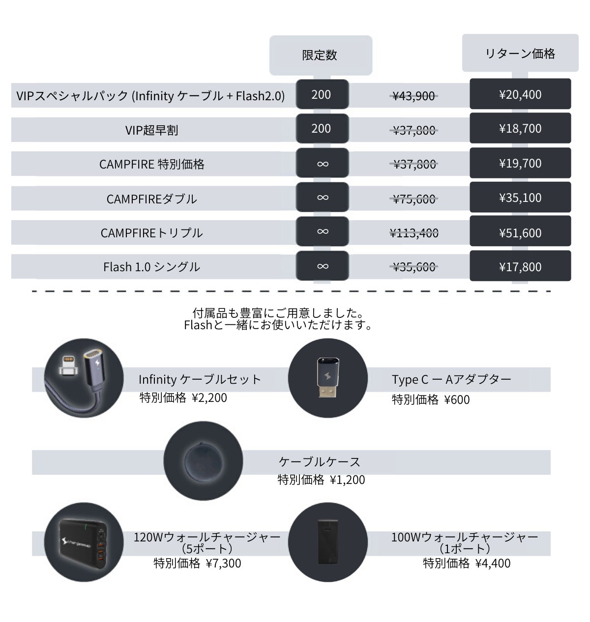 ・VIP限定では『Flash 2.0 (フラッシュ 2.0)』と一足早くInfinityケーブルセットを54%オフ(通常販売価格43900円)の20400円にてお買い求めいただけます。 もう少しSAVEしたいという方にも、Flash1.0を17800円よりご用意しております。。