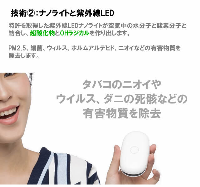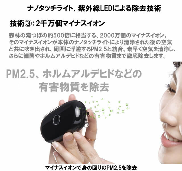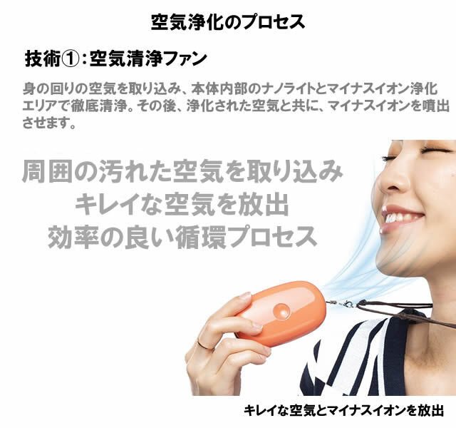 - 2、マイナスイオン、ナノライト、紫外線LEDで徹底的に空気を清浄。空気を取り込む首掛け空気清浄機!
