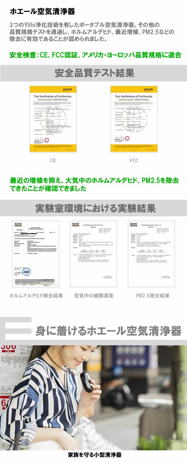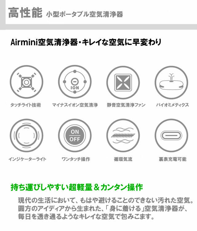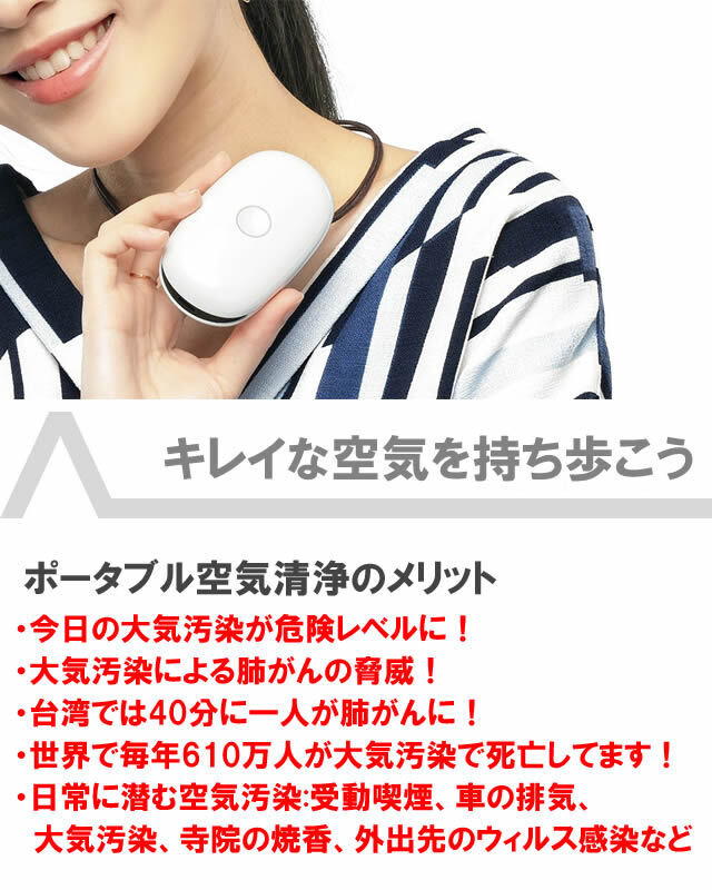 - 1、超軽量92gの身に着ける高機能「ポータブル空気清浄機」。汚い空気や有害物質などから守ります!
