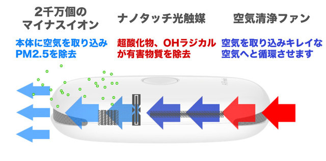 2000万個の マイナスイオン が ナノタッチライト により 清浄 された 空気 と共に吹き出され周囲に浮遊する PM2.5 と結合。