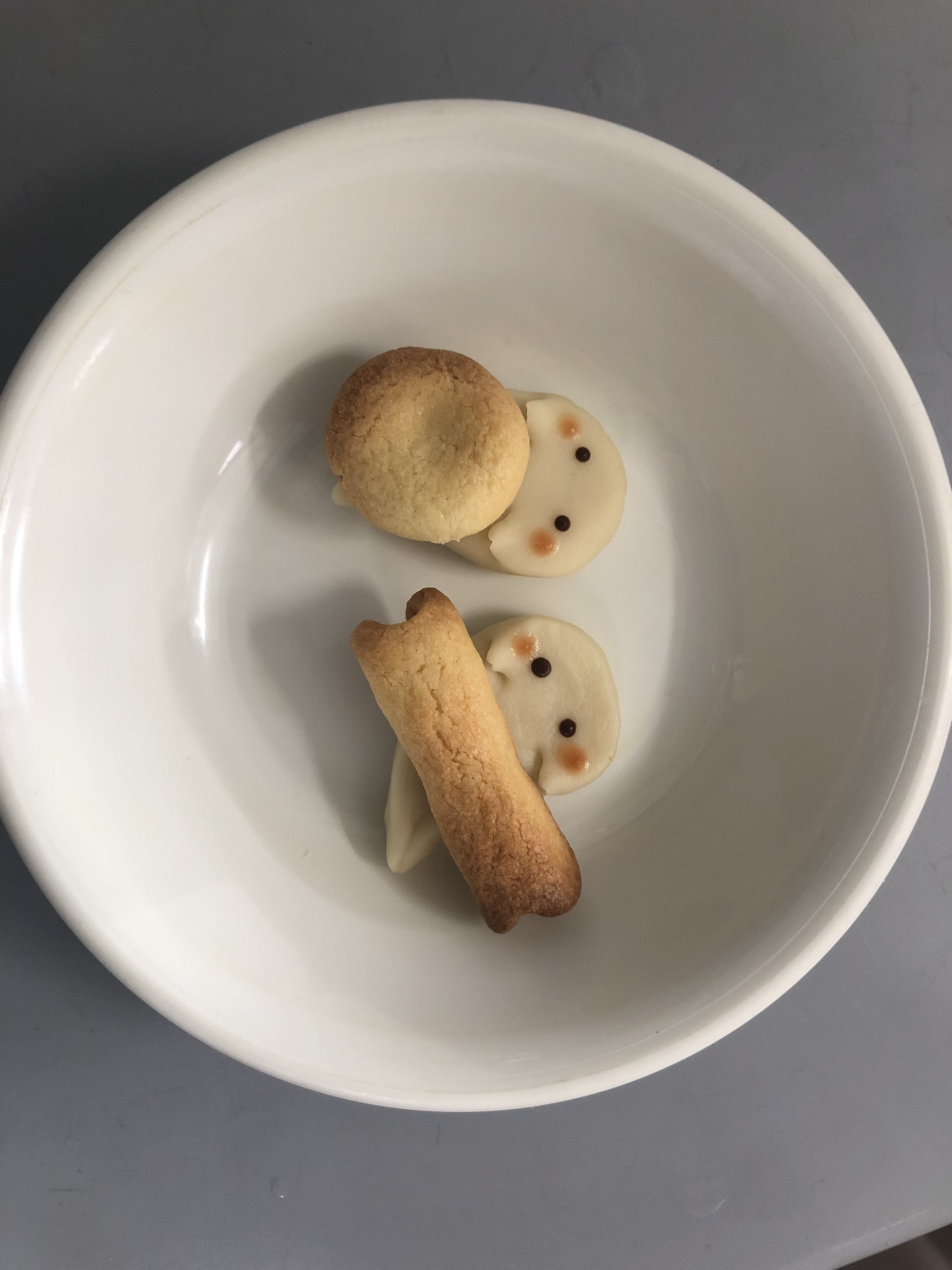 乳アレルギーの子のために、小麦のみで作ったクッキー。お化けはマシュマロを溶かして、小麦と練った物。ハロウィン用に作りました。