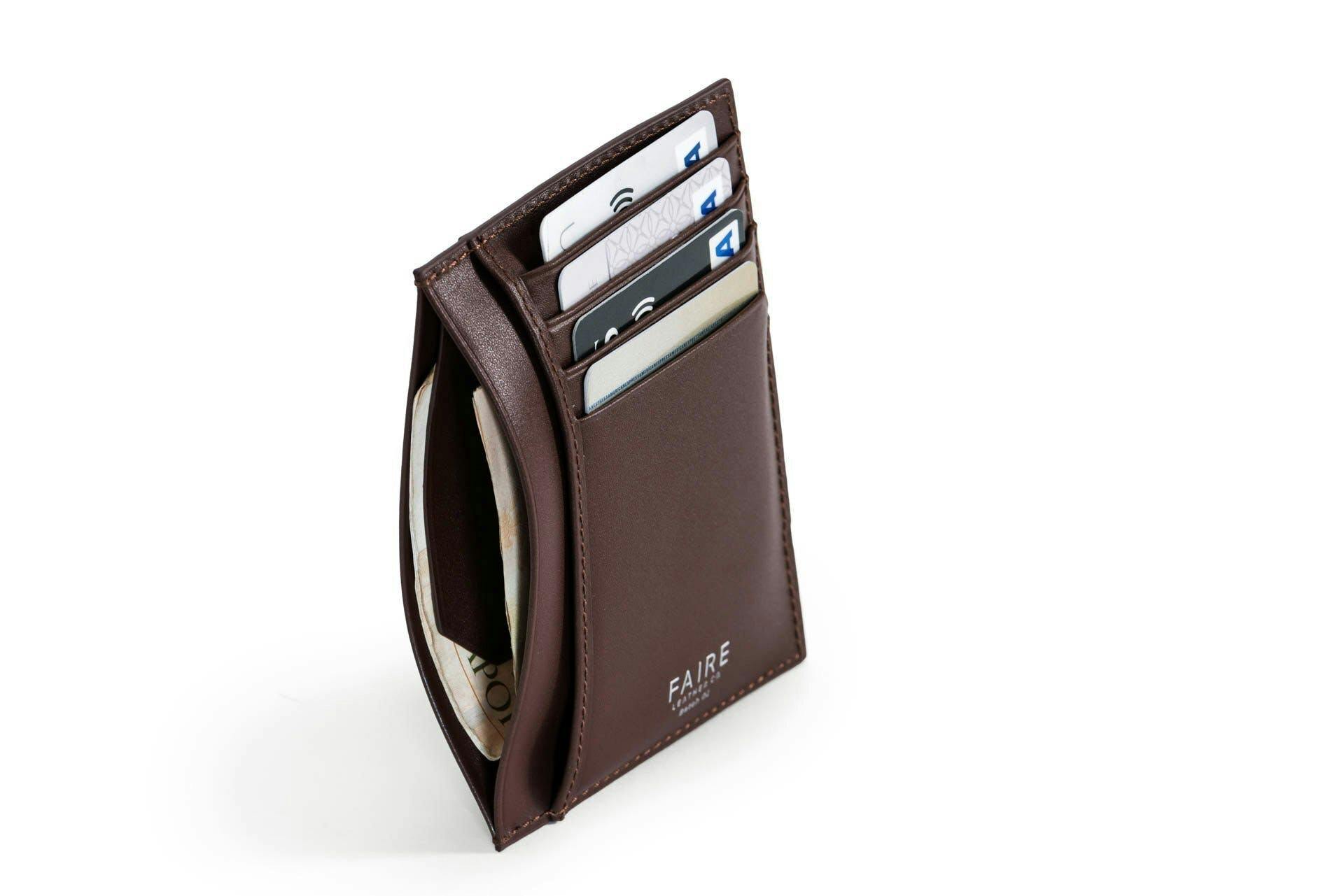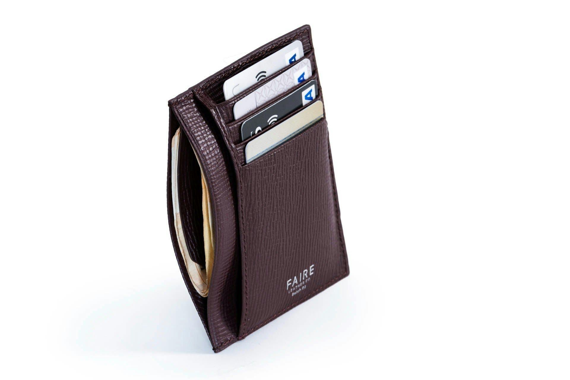 「FAIRE」のブリーフケースのプルタブ・スロットにぴったり収まるようにデザインされていて、RFIDブロック技術でクレジットカードを詐欺行為からも守ります。