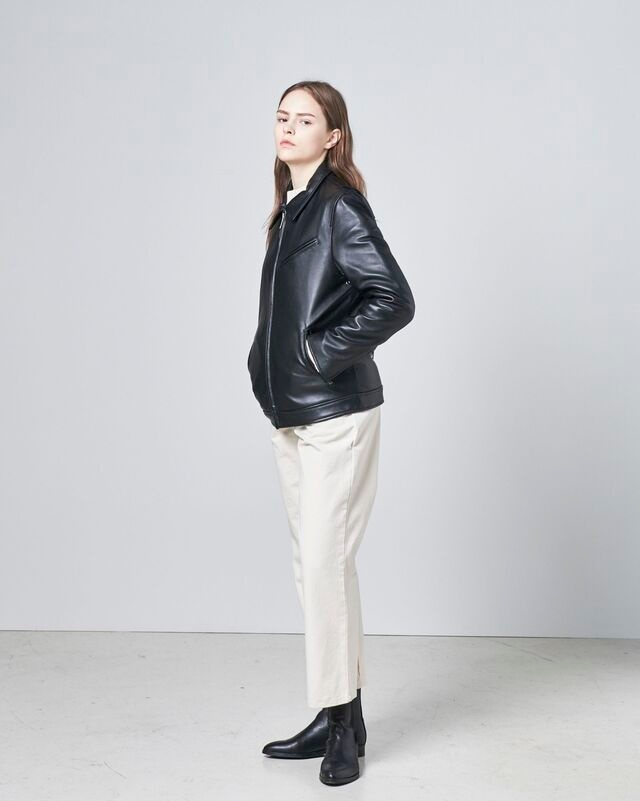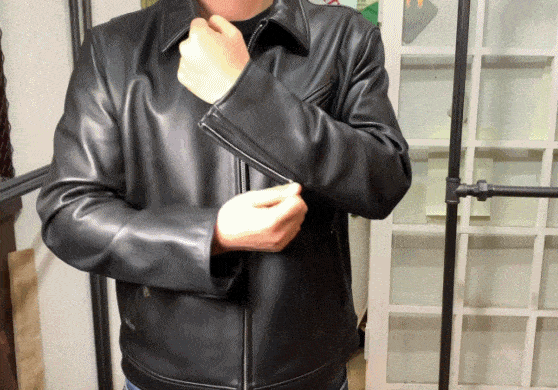 ダブルライダースジャケットと同じようにアクションプリーツと東洋人の体型を考えた人間工学に基づく型で、運動する時も着ることができるほど、革に感じられないフィット感と快適さを感じることができます。