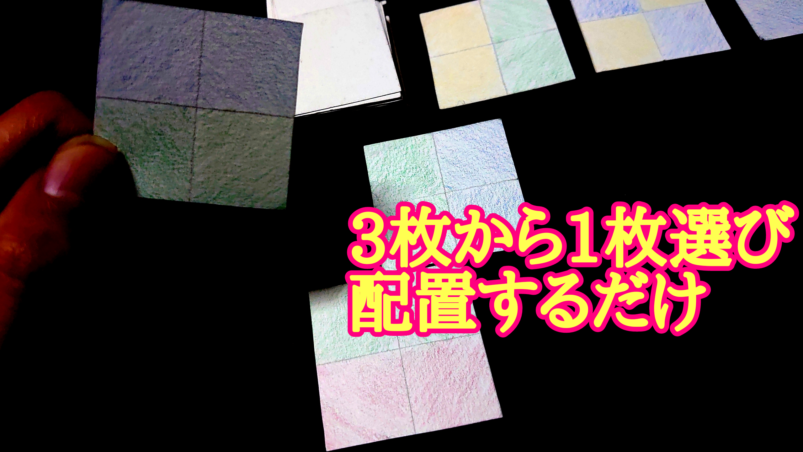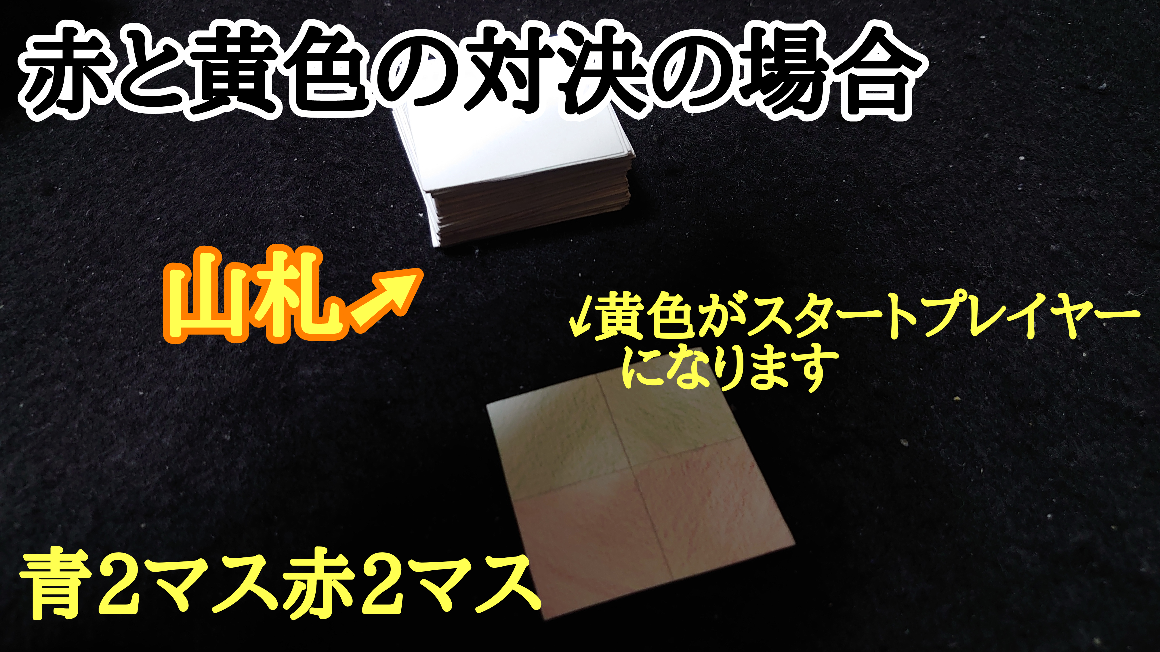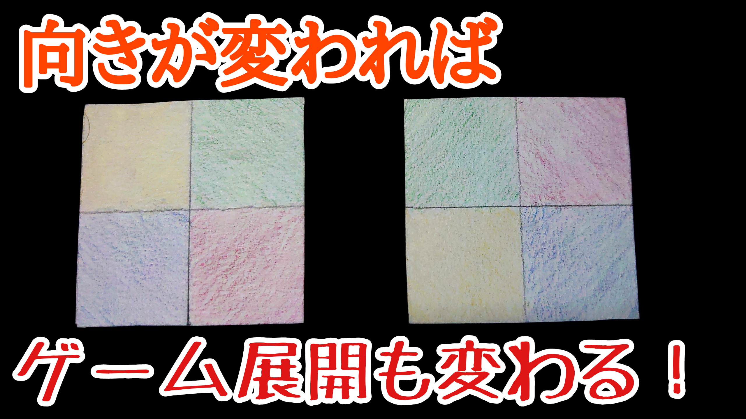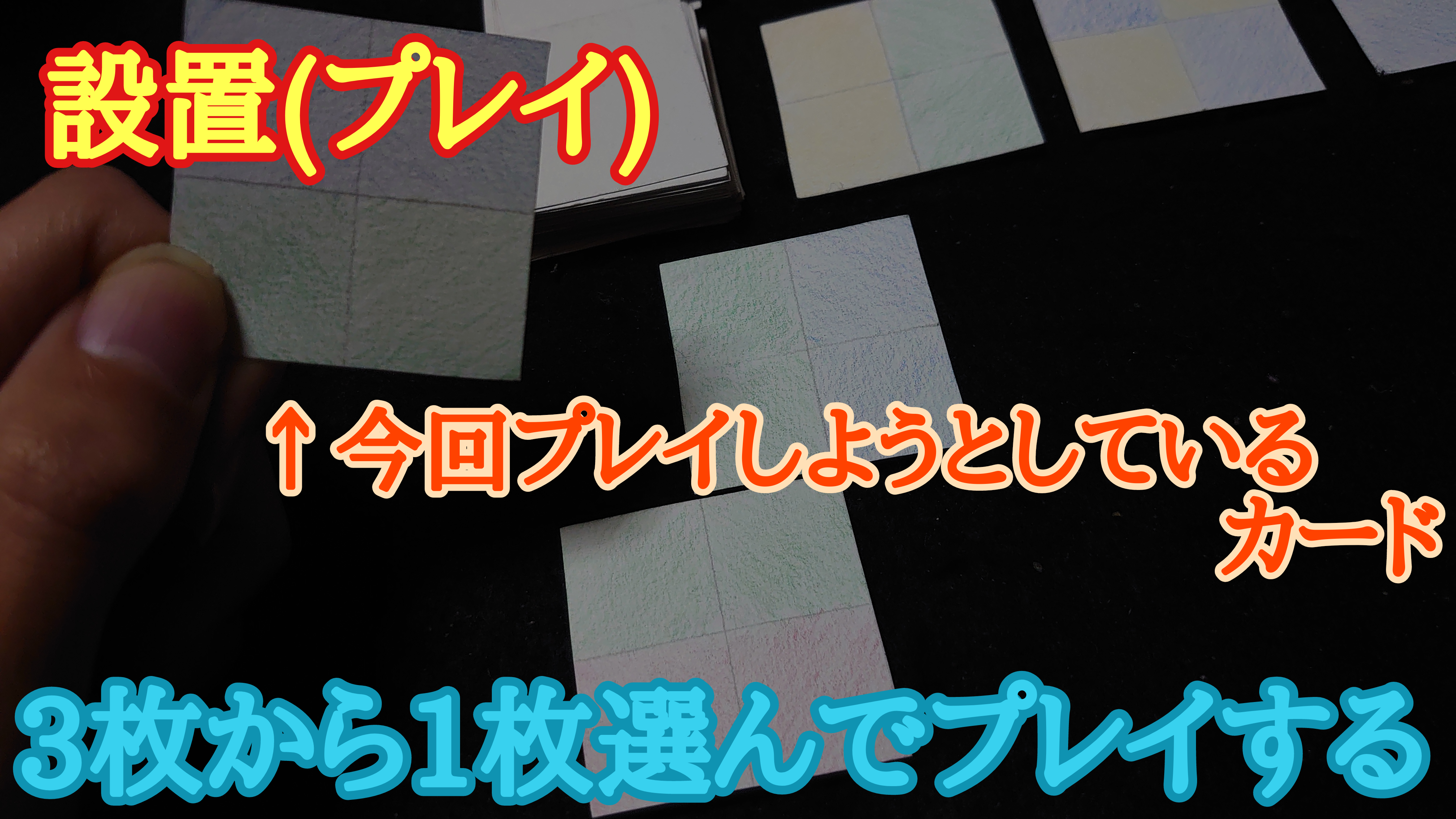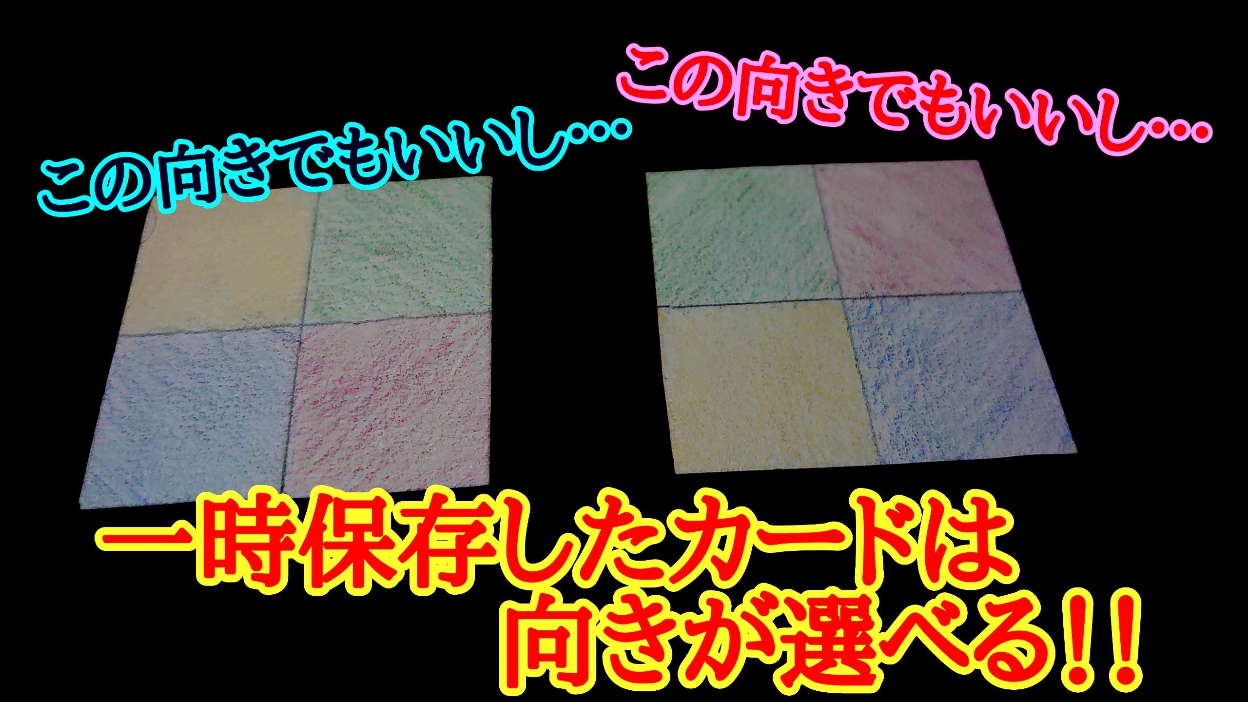 ※裏返しのカードを表にする時、表にする前は(カードが裏返しの状態では)カードの向きやめくり方を自由に変更できますが、一度表にして色を見てしまった場合はその向きから変更できません。