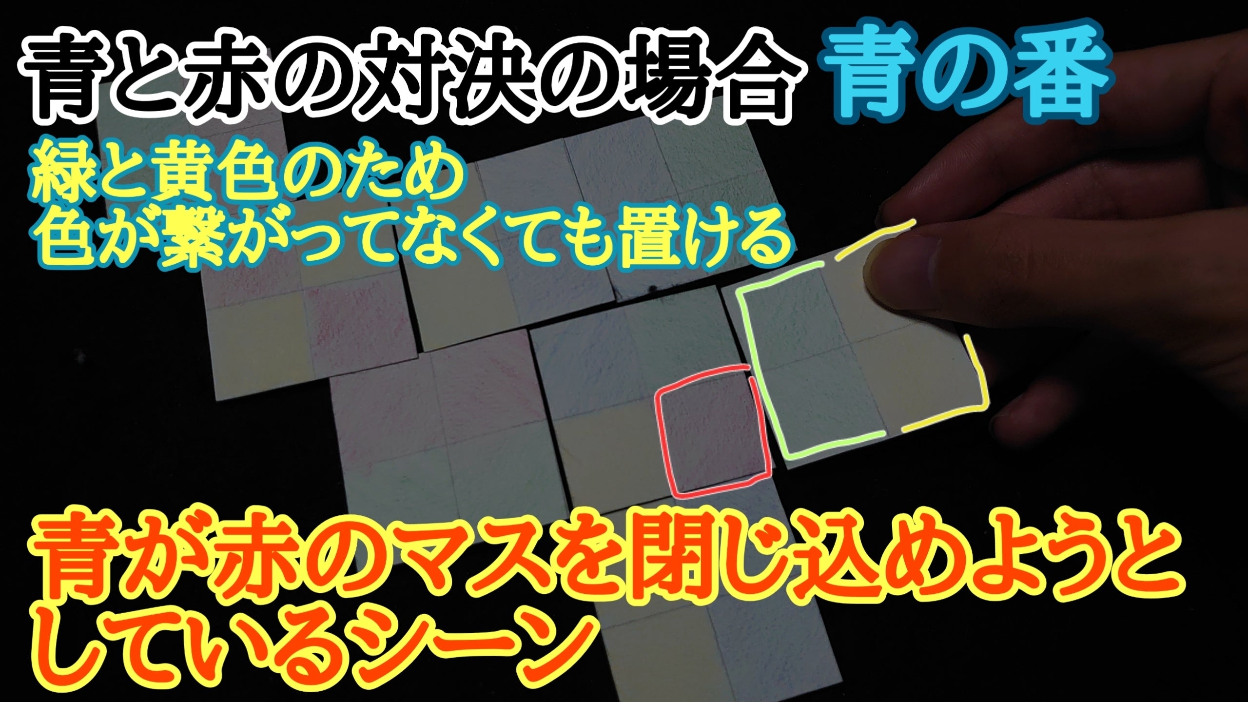 6.選んだカードの2×2の全4マスに自分の色がなければ『設置(プレイ)』のやり方の2.の隣接しているマスの中で1マス以上は同じ色でなければいけないは適用されません。※必ず他のカードと隣接して置かなければいけないことは適用されます。