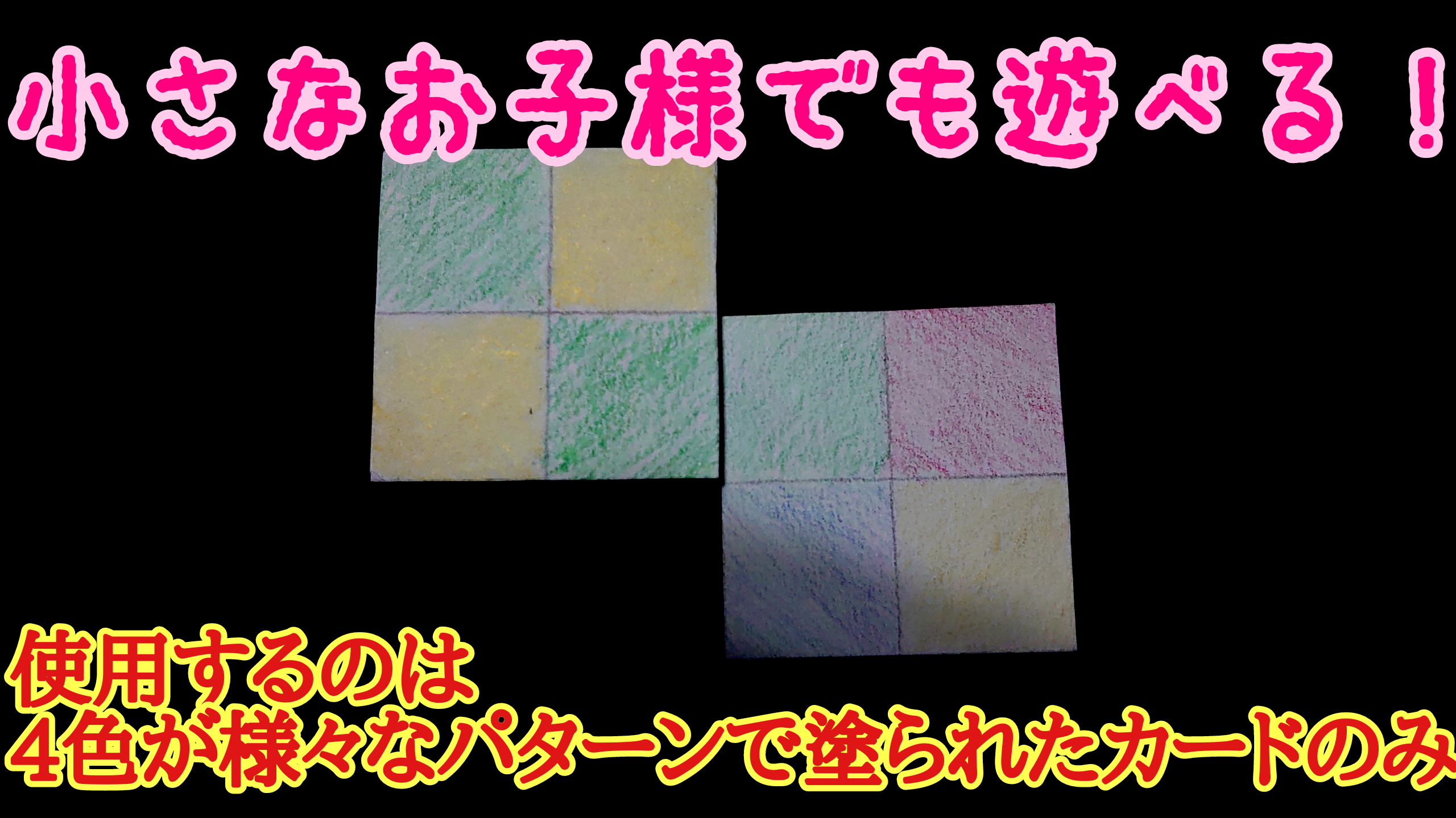 4色の色が塗られたカード全56枚しか使わないため小さなお子様でも遊べます。子どもでも大人でも楽しいゲームをテーマとしました。