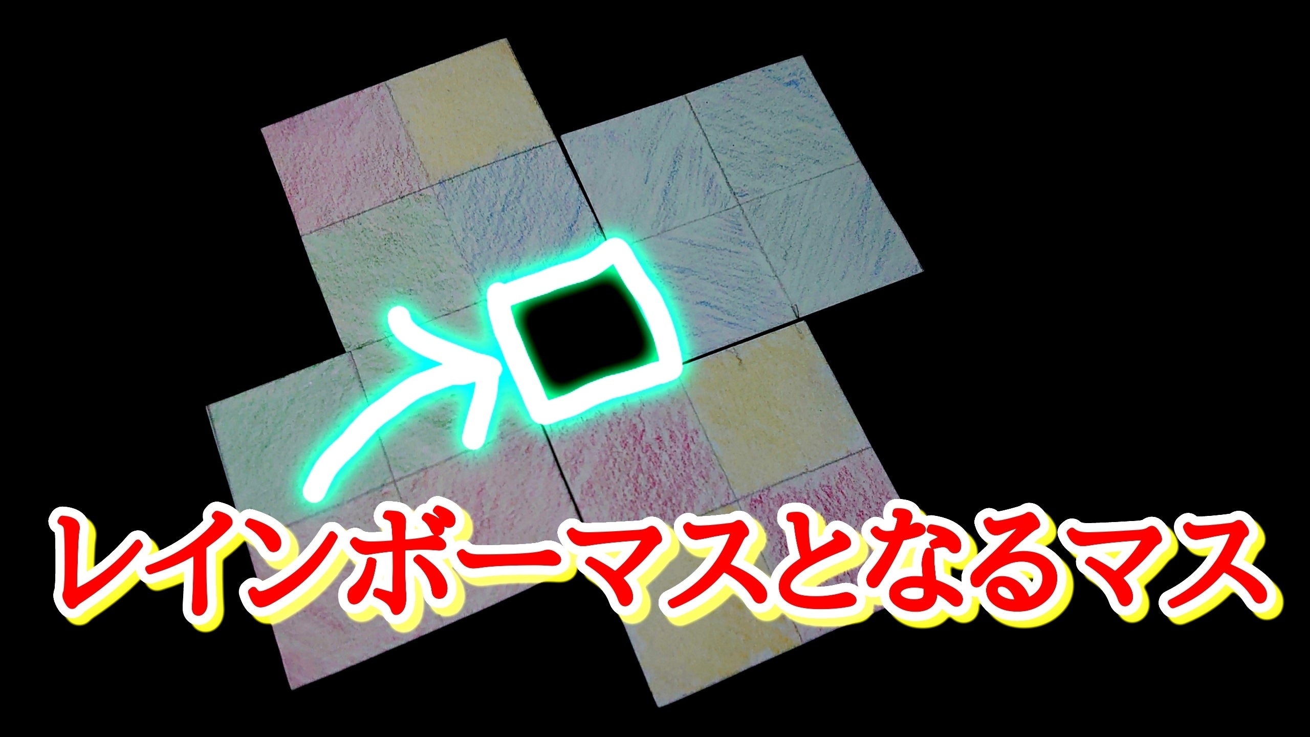 5.写真の黒いマスのようにゲーム中空マスがうまれてもOK この黒いマス(周りの8マスが全て埋まっているマス)はレインボーマスとなり、どの色にも対応するマスとなる。
