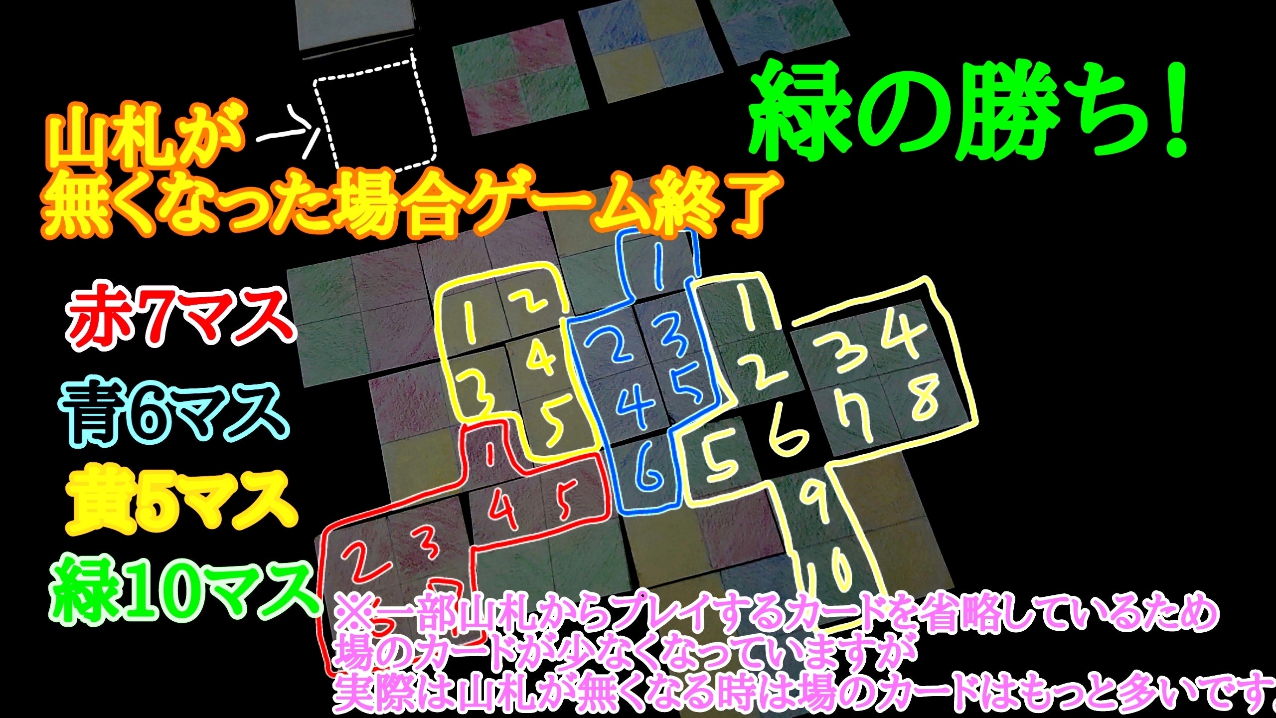 ◆山札が無くなった時点でゲーム終了。その時点で各プレイヤー1番大きいかたまりを比べ1番大きいプレイヤーの勝ち。