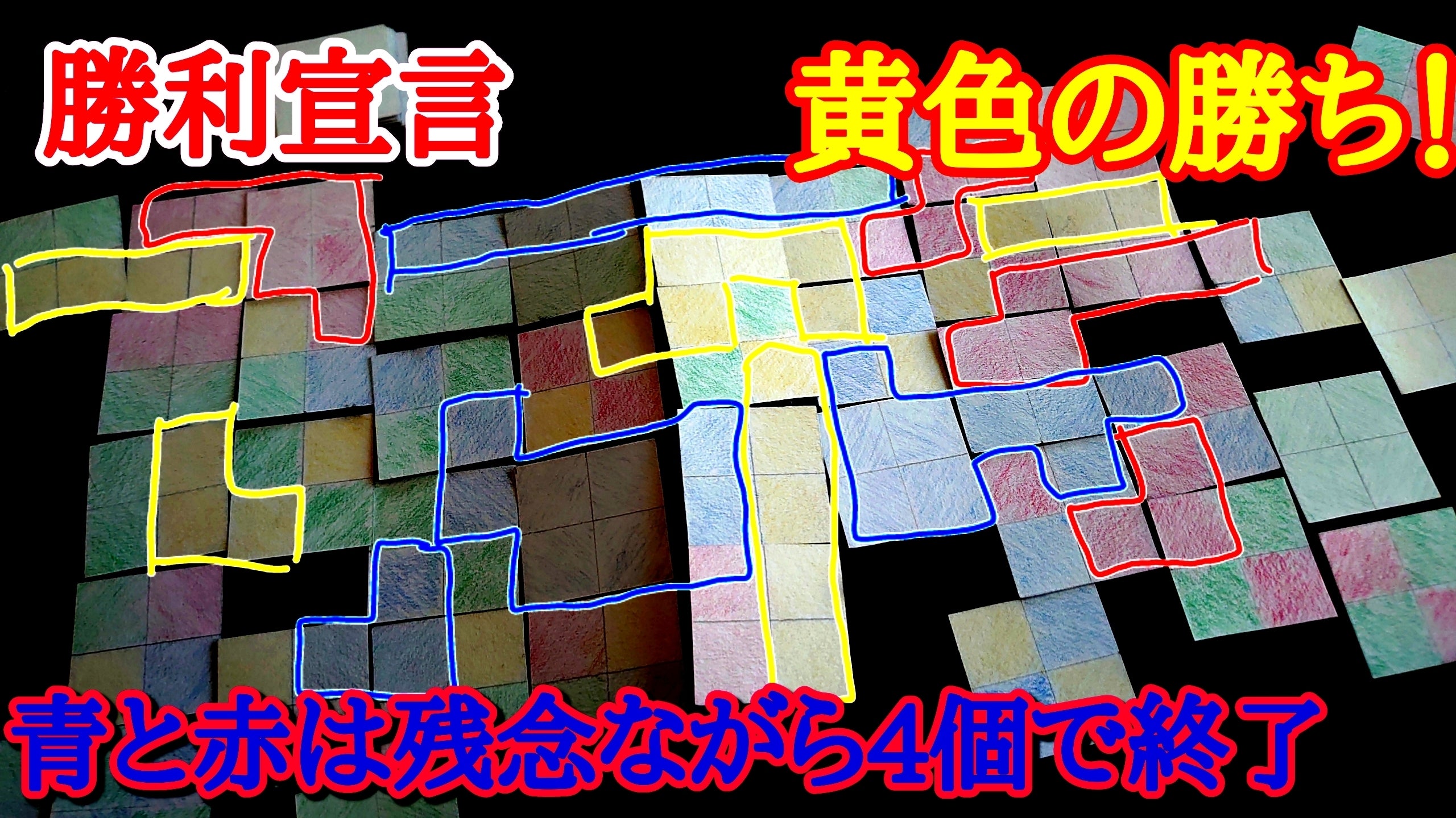 ◆自分の色の3マス以上のかたまりが5個以上できたのを確認したら自分の番でなくても勝利宣言をし勝利が確定!その人の1人勝ち。