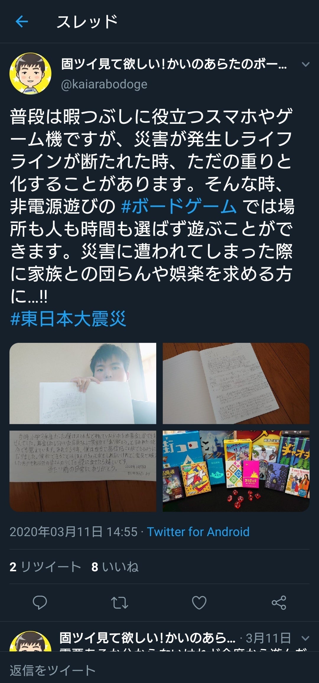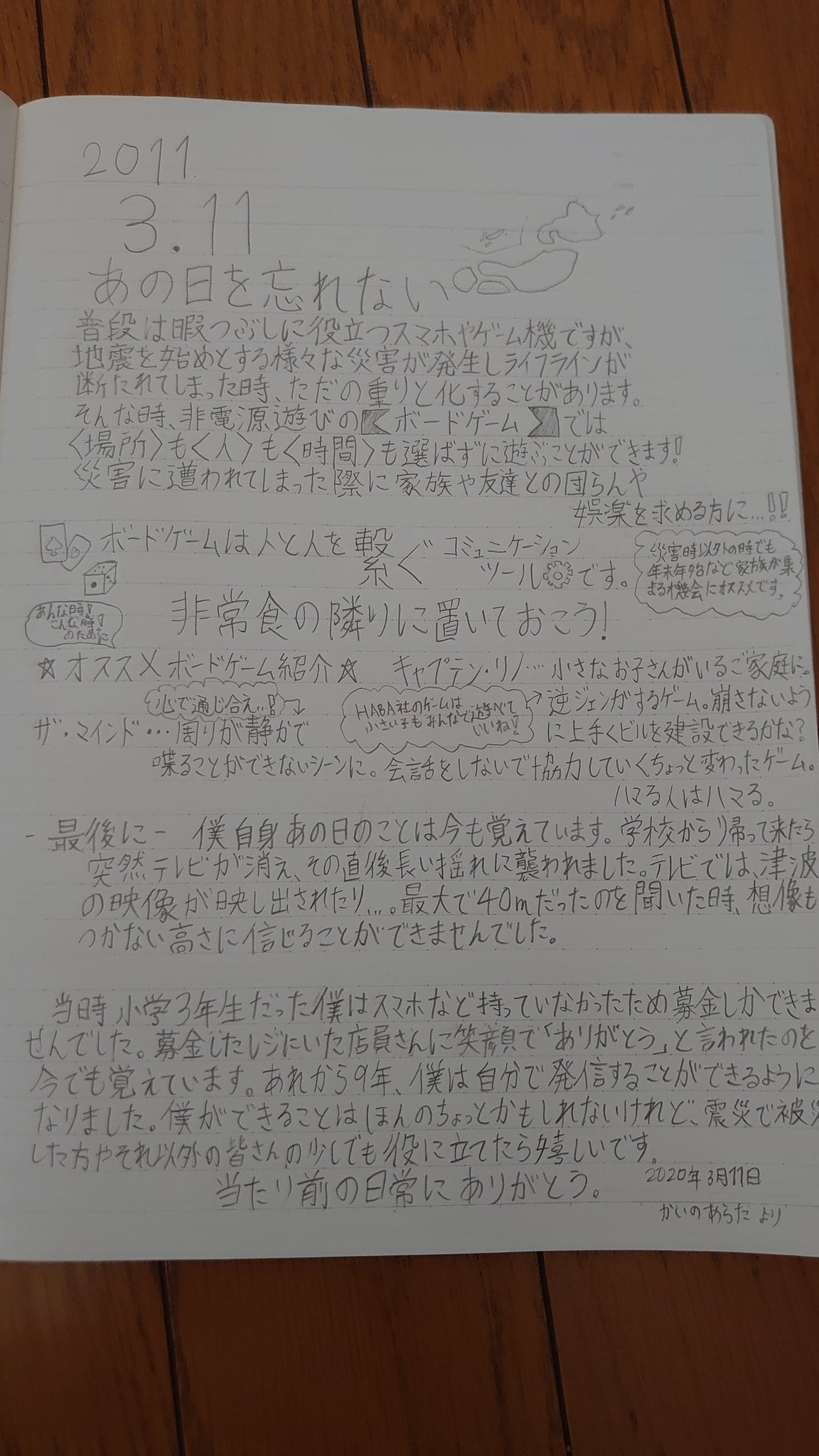 ▲写真は東日本大震災の発生日からちょうど9年である3月11日にツイートしたボードゲーム新聞になります。ボードゲームの良さについて自分なりにまとめました。