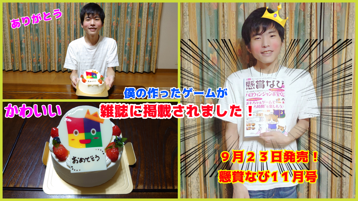 2020/09/24 13:00この度はプロジェクトにご支援・ご協力いただいた皆さん本当にありがとうございました!!なんと!日本で唯一の懸賞雑誌である『懸賞なび』さんにて僕の『カラータイルの王様』が掲載されちゃいました!!^_^僕自身もびっくりしています!嬉しいです!9月23日発売です!懸賞なび11月号は、お近くの本屋さんで売っていると思いますのでぜひ足を運んでみてください!見つけたら買ってくださいね!☆彡電子書籍がいい方は Amazon Kindle でも売っていますのでそちらで!!雑誌に載ったことを記念して「カラータイルくんケーキ」を食べました!!かわいいタイルくんの顔に癒やされます^_^食べるのがもったいないです(笑)もちろんおいしくいただきます!ゲーム本体につきましては、只今印刷会社様の方で制作をお願いしている最中です。当初の予想よりも少し時間がかかってしまっています。届き次第すぐにリターン品の発送を致しますのでよろしくお願い致します。今日も見てくれてありがとうございました!!^_^ もっと見る