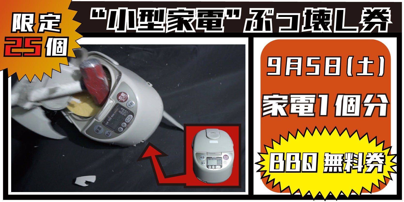 それ以外にも、バイク、自転車、食器、小型家電が壊せる世界初の「破壊のお祭り」となります。