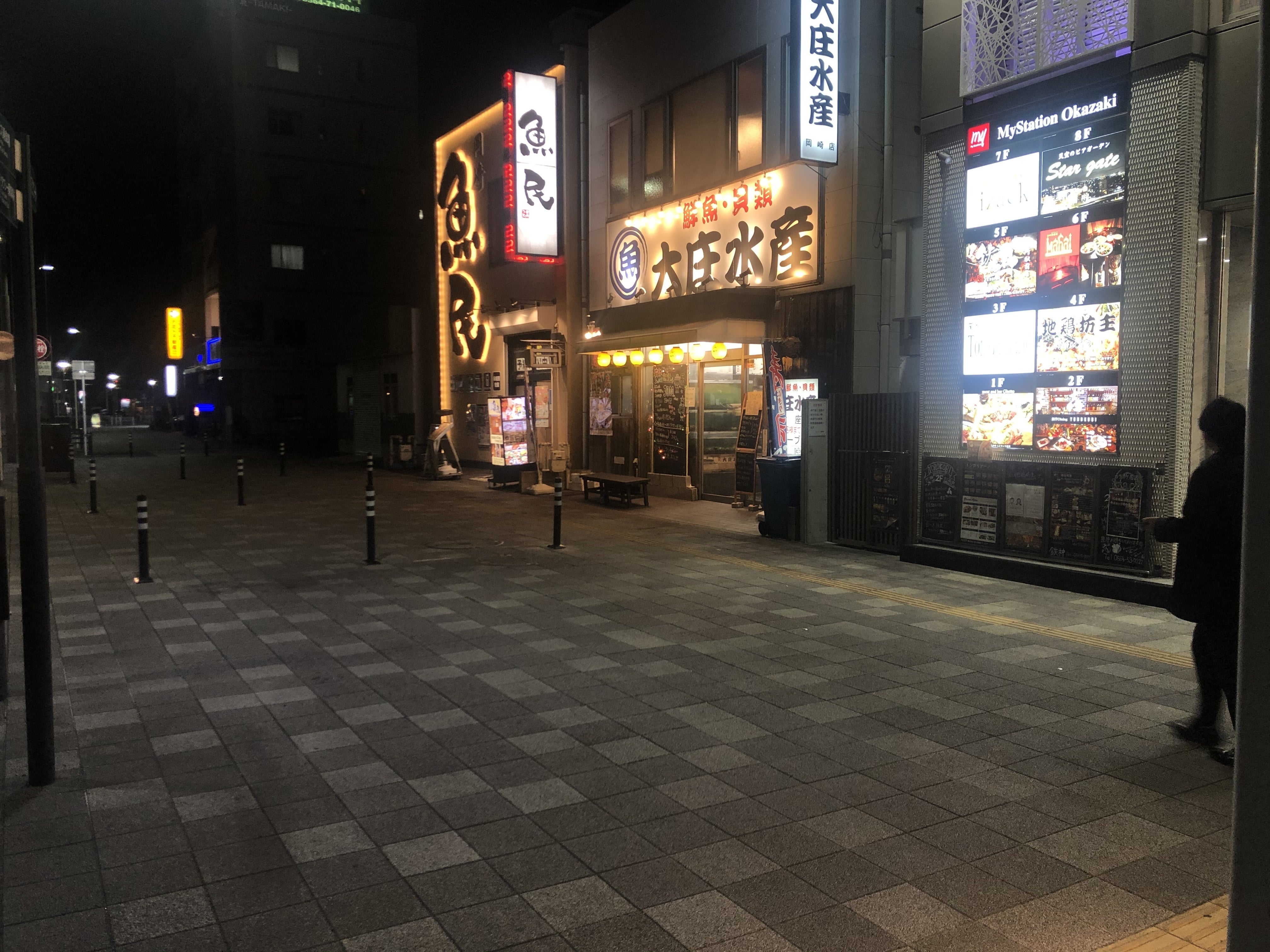 当社の飲食店「トンガリアーノJR岡崎駅前店」の前の通りです。特に週末は人でにぎわいますが、今はこの様に人が歩いていない状況です。