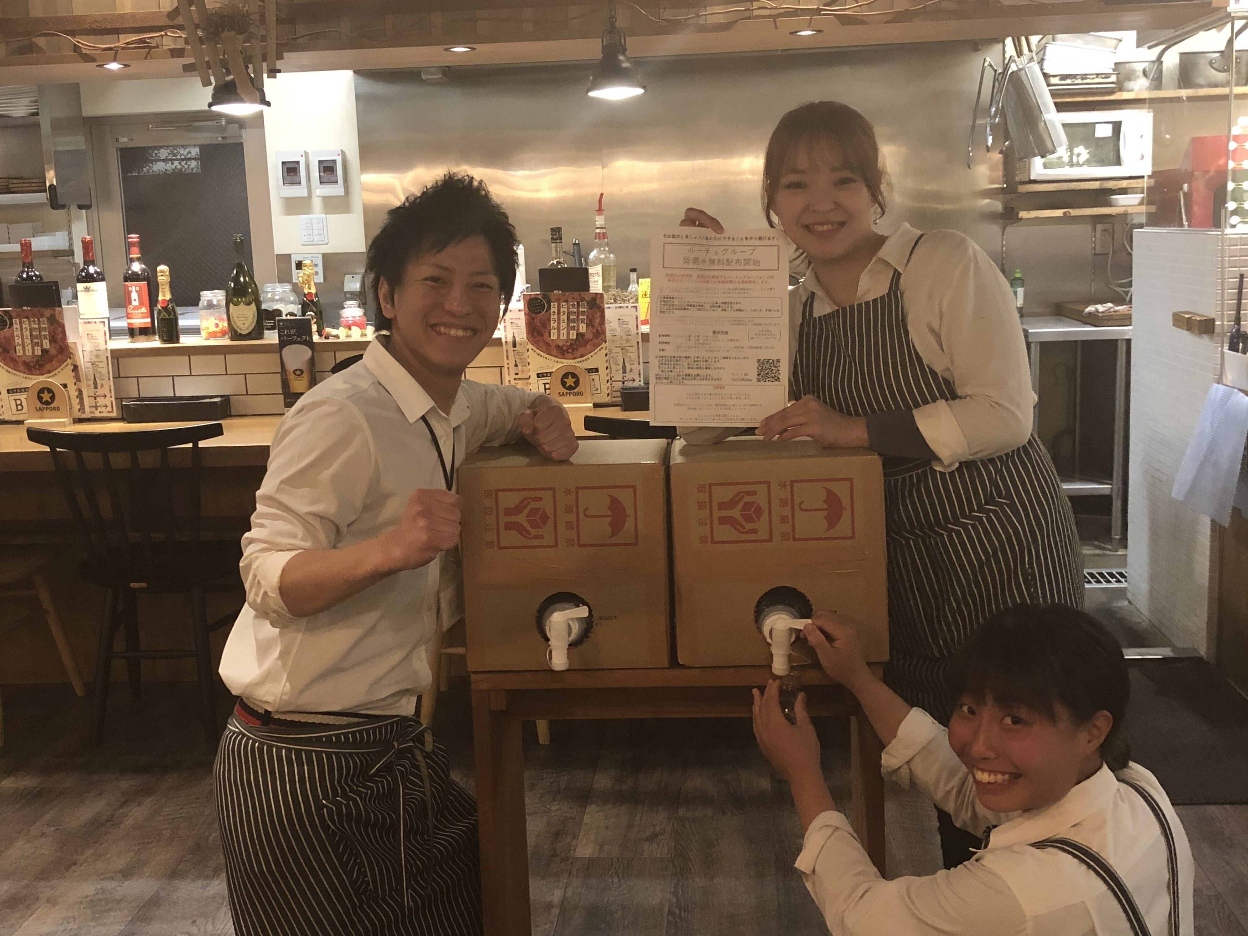 除菌水の無料配布現場は飲食のスタッフ達と美容師達が通常業務の合間をぬって頑張っています。