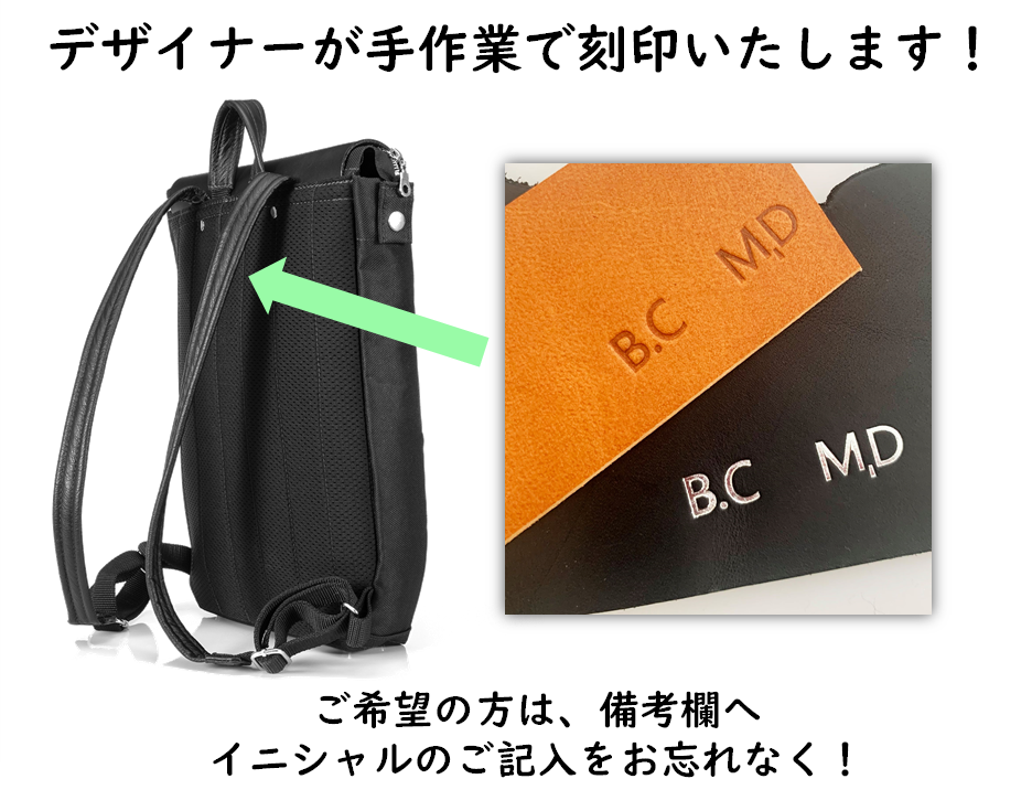 バックパックにイニシャルを刻印いたします。