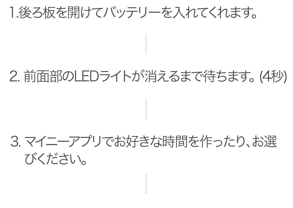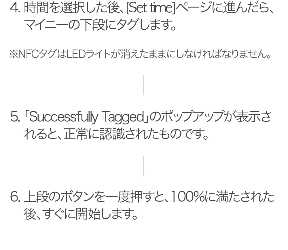 マイニーアプリの[my time]ページで、カード状の左上のチェック印を押した後、製品に入力していただければ、現在の機器に入力された時間を知ることが出来ます。