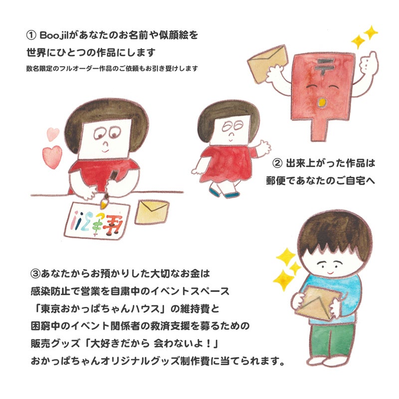 2020/12/25 13:47みなさま、ご無沙汰しております。お元気でお過ごしでしょうか?メリークリスマス!!!!!!!!!!!!!!!こちらは、なんとか元気に過ごすことができています。東京おかっぱちゃんハウス、クラウドファンディング、プロジェクトリーダーのBoojilです。今年の春実施しました、クラウドファンディングの結果報告と現状況について報告をさせていただきます。本当に多くの方に支えられ、東京おかっぱちゃんハウスは、今年いっぱい維持をすることができました。本当にありがとうございました。支援してくださる方の人数が想像していたより多く、大きな作品のリターンについては、2021年1月ー2月末を目安に納品させていただくことになりました。それ以外の作品に関しましては、リターンのご送付が完了しております。万が一、届いていない方がいらっしゃいましたらご連絡くださいませ。つきましては、ご支援で集まった資金についてですが下記のように使用させていただきましたのでご報告させていただきます。●支援金「5,197,125円」 資金の使い道(支援者427名様)・店舗維持費 6ヶ月分 3,000,000円・リターン制作費(❶ー❽)❶グッズ制作費 123,575円❷額装代 496,482円❸絵本仕入れ値 68,068円❹画材代 35,460円❺インスタライブ アーティスト出演費とその方のグッズ購入費 214,995円❻梱包材・ダンボール購入費 30668円❼リターン配送料 150,770円❽人件費 183,080円合計: 4303,098円支援金:5,197,125円ー4303,098円= 残金 894,027円そこから10%の「89,403円」にWEBSHOPで販売した”おかっぱちゃん”オリジナルグッズの売上より10,597円追加し「100,000円」を国連WFPに寄付させていただきました。■受付内容 *2020年12月25日に寄付完了[取引番号] CWFP20201225123308556[寄付方法] 今回の寄付[寄付金額] ¥100,000[お支払方法] クレジット[使途] 緊急支援https://ja.wfp.org/emergencies/covid-19-pandemic寄付金を引いた残り「804,624円」に関しましては当面の店舗維持費とさせていただきます。感染者増加傾向にあり、この勢いが止まらない限り、世の中の状況も落ち着かないように思います。周りでも不安を抱えていらっしゃる方も多いように思います。お店の営業も7月から再開をしましたが、やはり開催できるイベントとそうでないものがあり、なかなか通常運行とはいかない状況です。今までの形態を変えずにイベントスペースを主として運営していくことは、この状況が続くと、非常難しくなると考えてもいます。今年の3−6月までお客様のことを考え、思いやりをもってお店の営業を停止しましたが、経済をすべてストップさせることで、わたしどもの業種を含む、接客業を伴う商売をされている方や表現の場を必要とするアーティストにとっては、大きな損失が存在することも身をもって体験しました。また、そこには心の負担も大きくあり、金銭よりも大切な精神面に多大な影響を及ぼすものであることもわかりました。正解がどこにあるのか、わからない状況ですが、現時点での私が考えていることをここに記させていただきます。「大好きだから会わないよ。」春にこの言葉を掲げてまいりましたが、感染症の影響がここまで長期化した今、この言葉はとらえる相手によって捉え方が、変化するものだと思うようになりました。人に会うことが経済をまわすアクションになっている場合もあるし、互いがエネルギーをもらって元気づけるきっかけにもなる場合もある。どちらにせよ、100人いれば考えは100通り考え方があるということを理解し、思いやりをもってわたしたちにできる仕事をしたいと思っています。自分の中では、どういう状況であっても、リアルなコミュニケーションが人にとって心の支えになること、その重要性を強く感じています。文化に触れる機会や、人と人がコミュニケーションをとることも、この時代を前向きに生きていくには必要なことだと思っています。わたしどもは、感染防止対策をしっかりした上で、展示会をメインとしたイベントを今後も自主開催してまいります。密になることを避けた内容であれば、レンタルに関しましても、積極的に会場のお貸出しをさせていただきます。感染状況が緩和し、以前のような暮らしが取り戻せるようになった暁には、ご支援くださったみなさまを含む、東京おかっぱちゃんハウスで大勢のお客様を迎えられるような催しを開催したいと思っています。長期化することが予想される感染症の影響ですが、2021年の幕開けは明るい未来を想像して迎えたいと思っています。どうぞみなさま、お体に気を付けて、良い新年をお迎えください。どうぞこれからも東京おかっぱちゃんハウスをどうぞよろしくお願いいたします。東京おかっぱちゃんハウス Boojil もっと見る