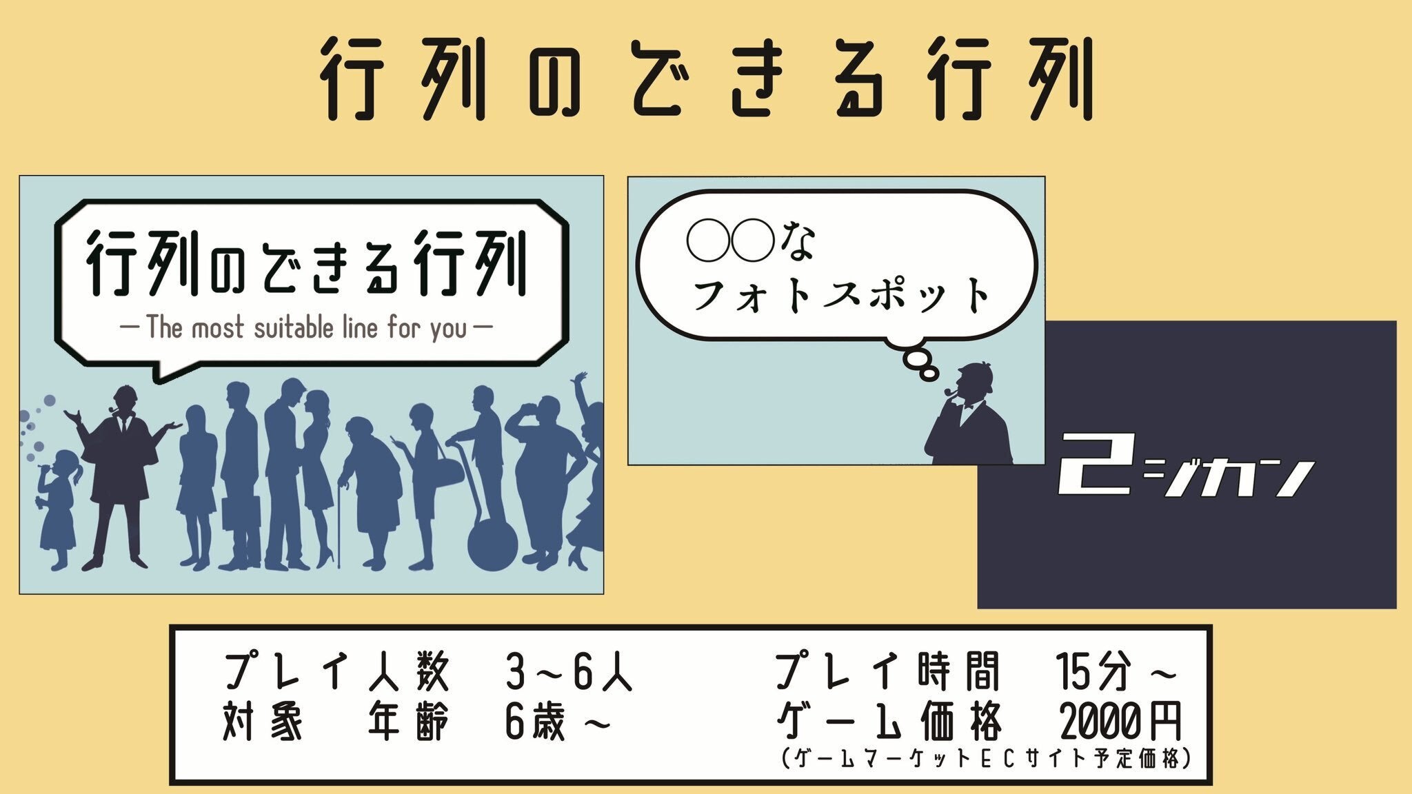 提示された「時間」と「シチュエーション」から、手番の親が「ギリギリその時間並べそうな行列」を提案しよう。親の思考をトレースし、より適度に魅力的な行列を提案した人間が勝者となる。足も疲れず、日差しも浴びず、想像の中に浮かぶ魅力的な行列を作り出す空想型ワードゲーム!