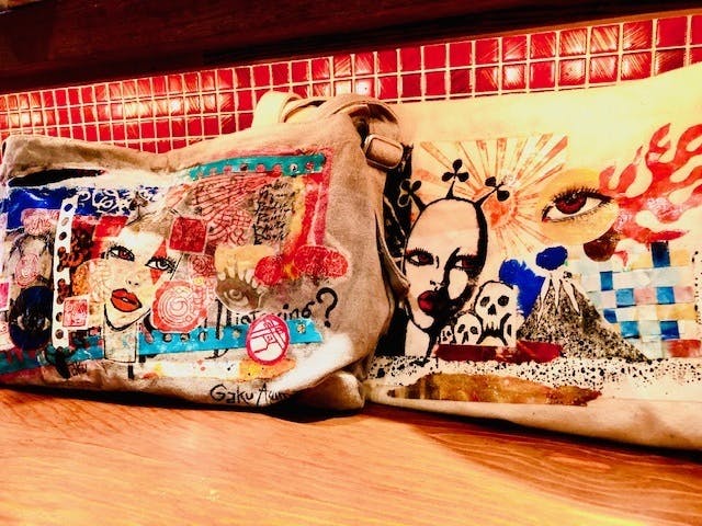 gakuazumaのデザインに関して、とくに地域性を意識したことはありませんが、日々、大阪ミナミは千日前というカオスな街で暮らしていること、そして、その土地がちょっと前までお笑いやお芝居の聖地だったこと、そしてそのもっと前が墓地や処刑場だったこと。そんな地縁みたいなものへの役割とか誇りを感じることもあります。明日から始まる新リターンに投入する、ブックバックは、ブックカバーと同じ手法をつかって布バッグにデコパージュしたもの。お試し用につくったものを自分たちでまず使ってみました。写真の撮影場所は、千日前のイタリアンレストラン。味園の向かいです。こうやってみると、本当にこの街のカオスな怪しさとカッコよさによく似合う。學さん本人はトランプガールといっていますが、ミス・ブランニューディとか、令和の東京ビクトリーならぬ、大阪ビクトリーをかんじるデザインです。