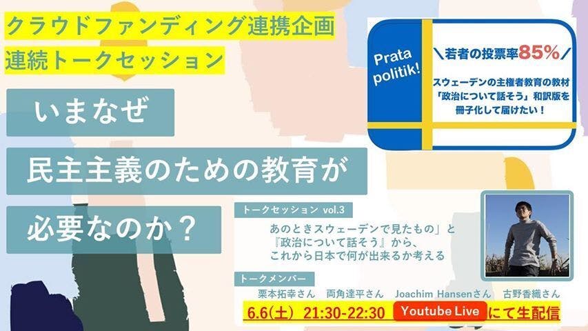 現在実施中のクラウドファンディング「スウェーデンの主権者教育の教材『政治について話そう』和訳版を冊子化して届けたい!」の応援企画として、連続トークセッションを実施します。クラウドファンディング実施の2か月間(7月11日まで)、「いまなぜ民主主義のための教育が必要なのか?」というテーマについて、さまざままな分野・立場の方と一緒に考えていきます。