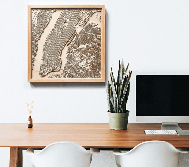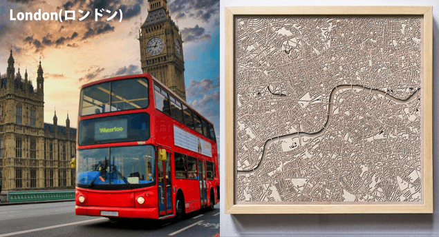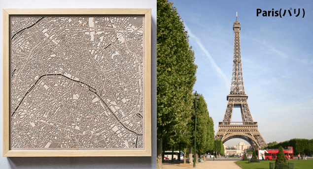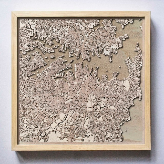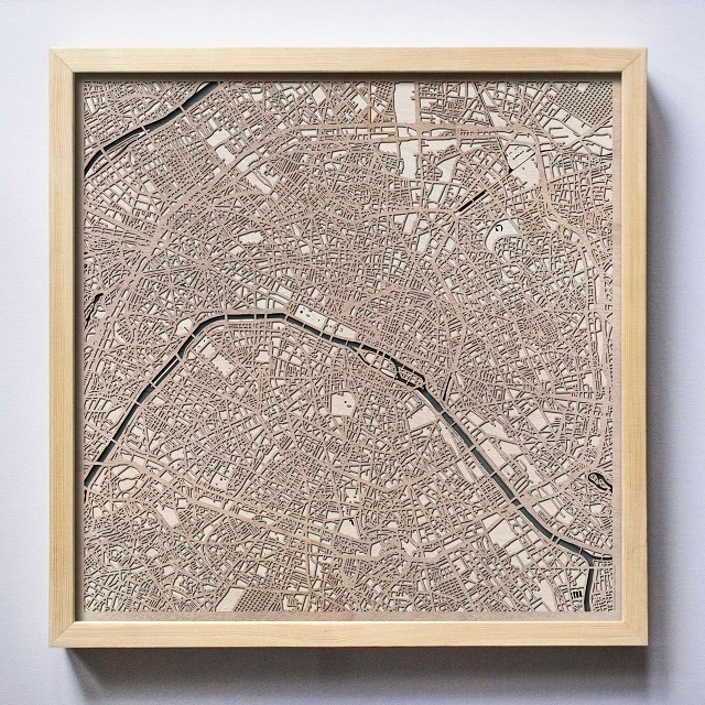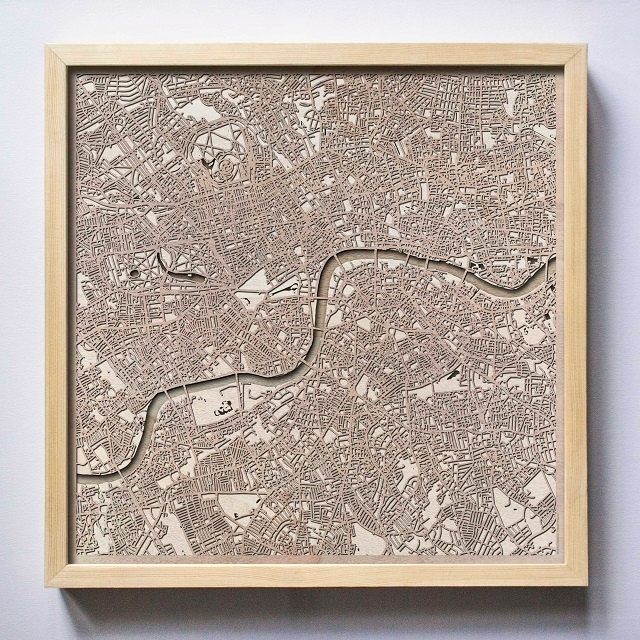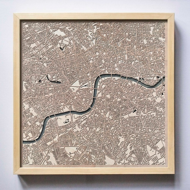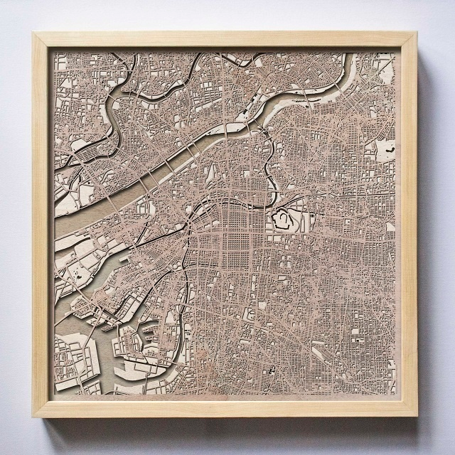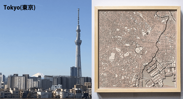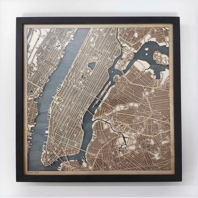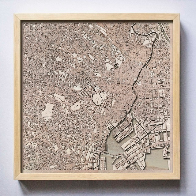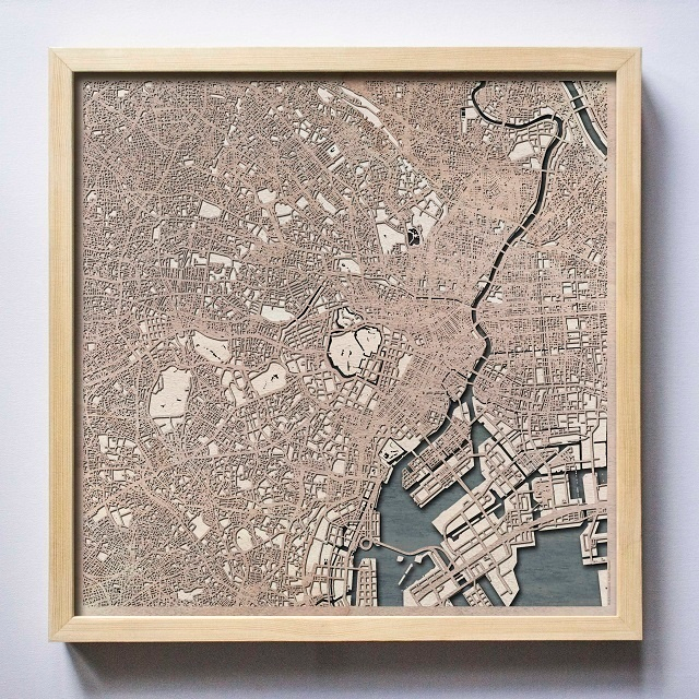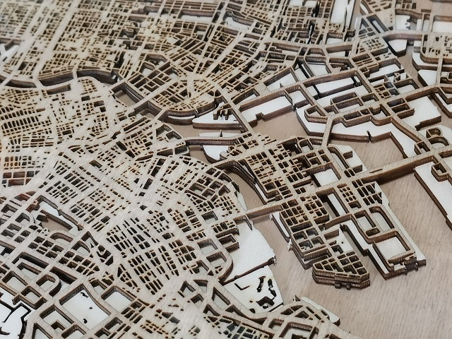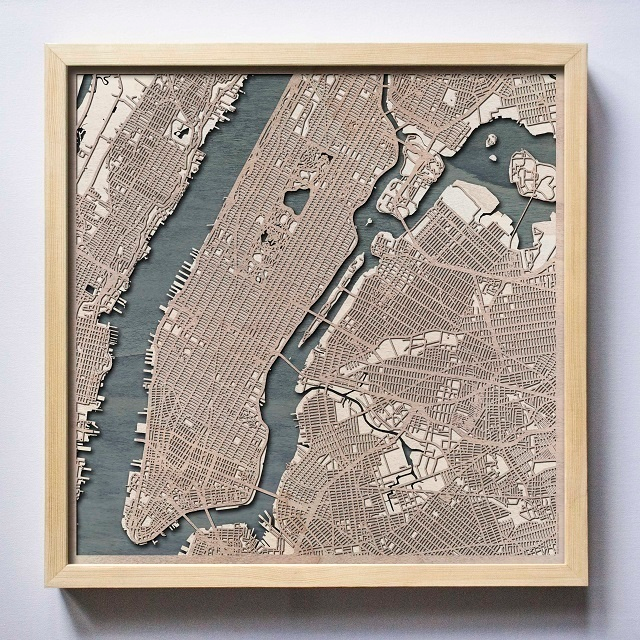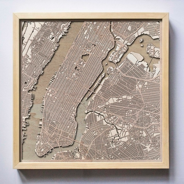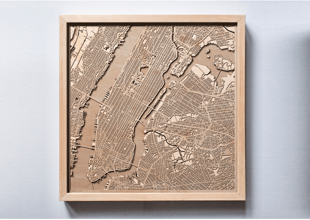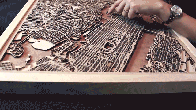世界の大都市をレーザーカットで精巧に表現した3D木製地図。