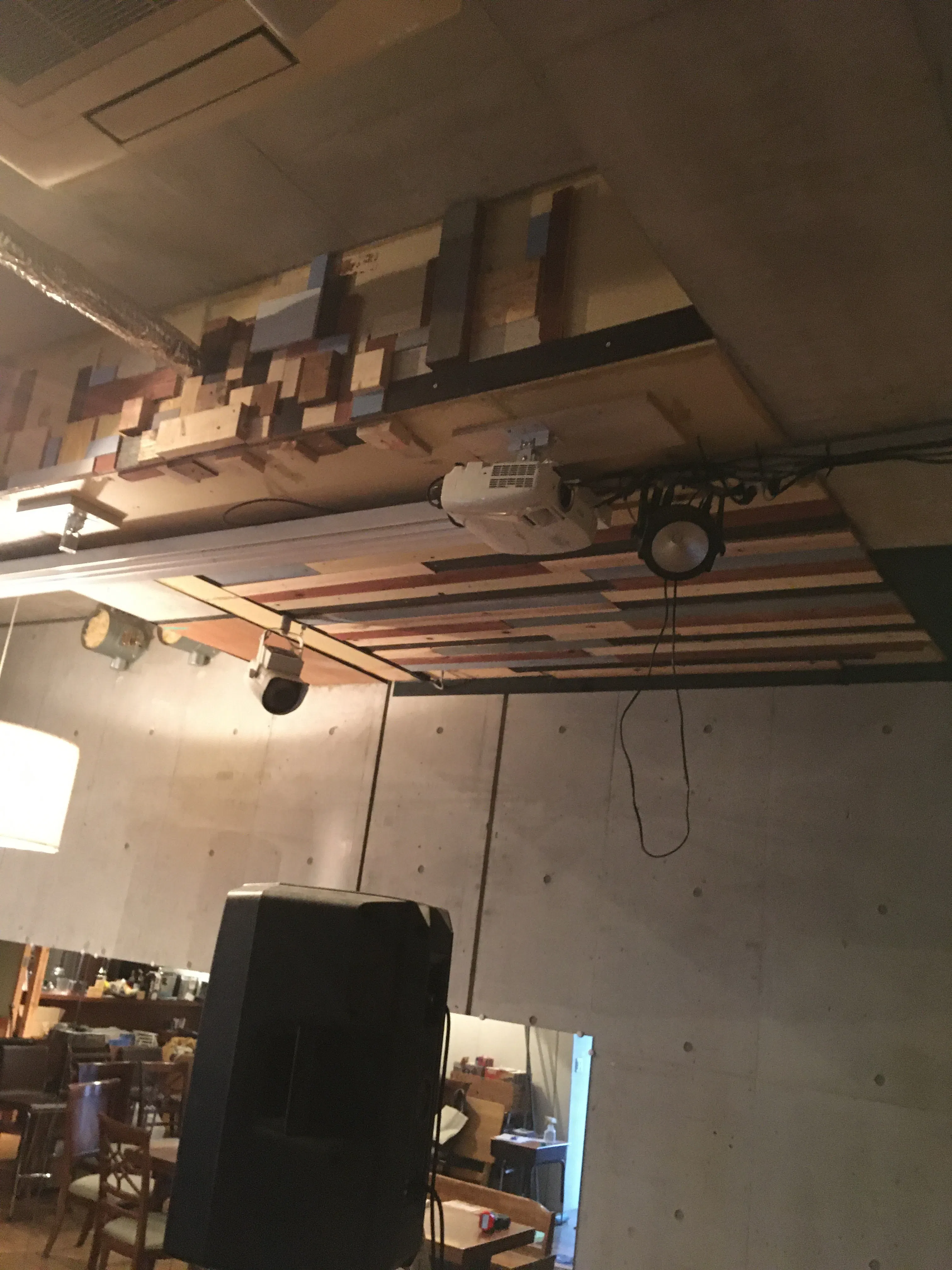 昨年の年末くらいから防音工事をしてたのですが、その最終仕上げで、カラフルな板材をモザイクで貼って行く、永遠に終わらない工事かと思っていましたが、要領得て来てだいぶ進みました。それに伴い、照明の移設やプロジェクターの宙つり(映画の上映会がいつでもできるよ)皆さまが戻って来る頃にはワンランク上のお洒落な天井目指して、ガウディしてます。