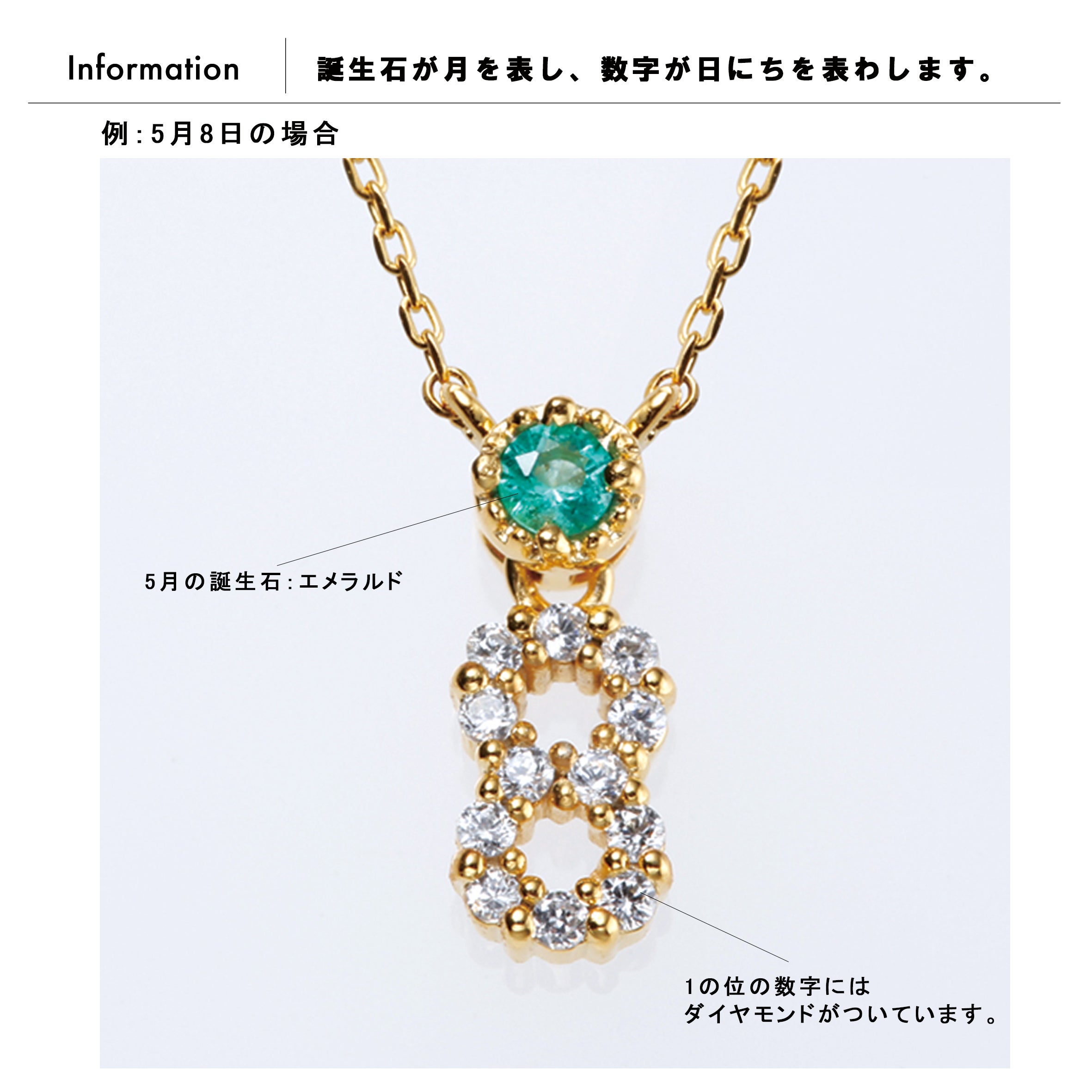 ストーン:各誕生石はすべて天然石です(1の位の数字には0.04ct~0.06ctのダイヤモンドが付いています。)