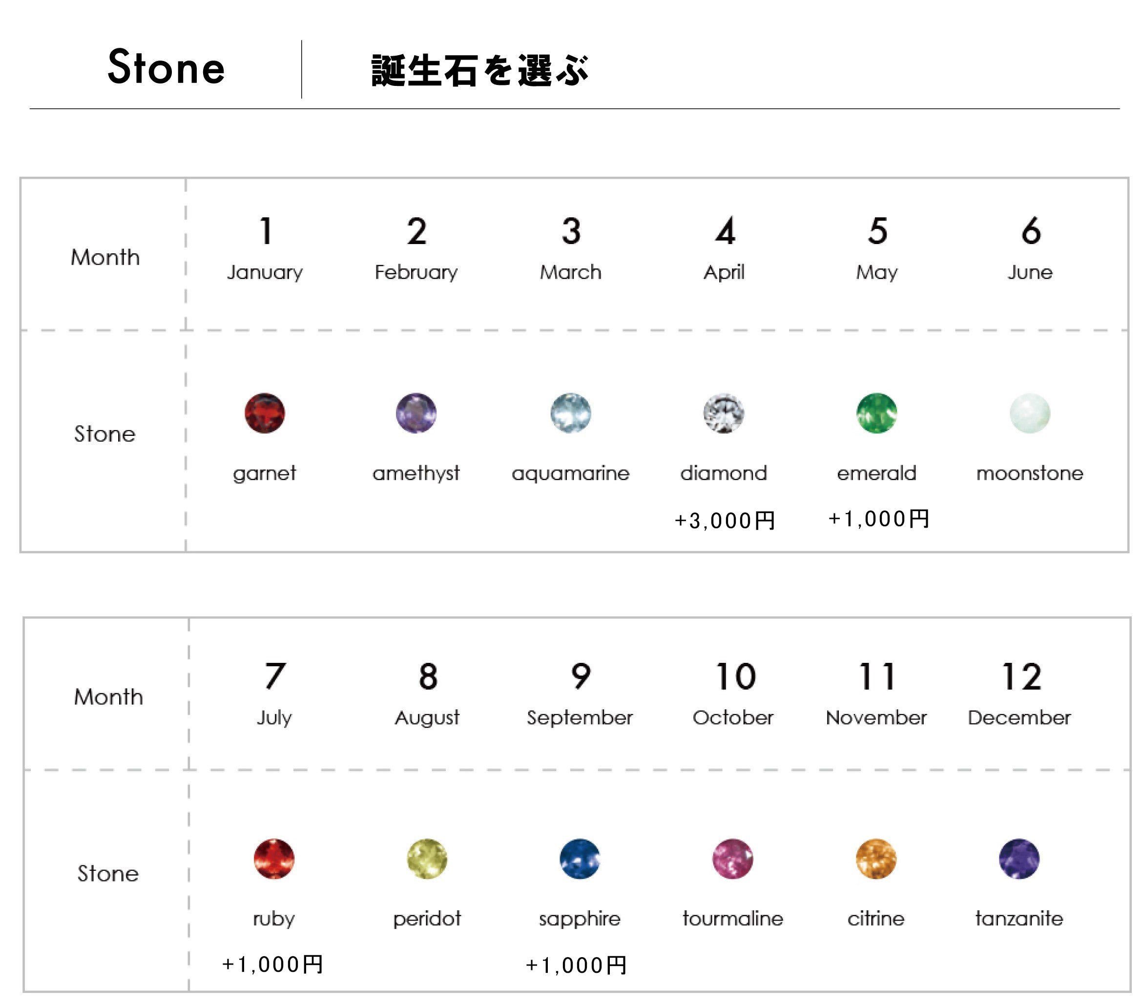 ※4月:ダイヤモンドは+3,000円、5月:エメラルド、7月:ルビー、9月:サファイアは+1,000円になります