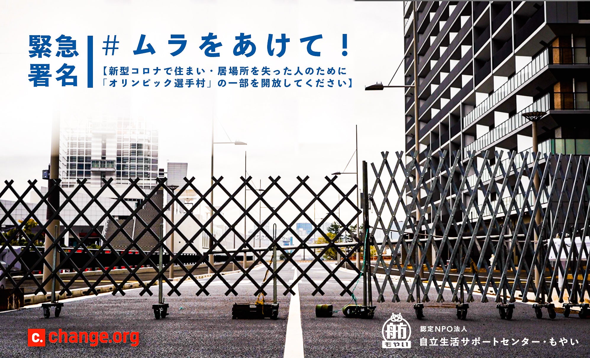 現在、もやい緊急支援プロジェクトの一環で行っている署名キャンペーンについて理事長・大西連のメッセージを収録した映像ができました!ぜひご覧ください。※映像は2020年3月より以前に撮影したものです。現在は医師などの指導を受け、感染症対策をしています。================映像クレジット:撮影・編集:田中悠輝(もやいスタッフ、映画監督)楽曲提供:cloud nine(9)https://www.cloudnine-9.com================#ムラをあけて 緊急署名キャンペーンよりhttps://www.change.org/muraoakero【新型コロナ】住まい・居場所を失った人のために「オリンピック選手村」の一部を開放してください私たちは、国内の貧困問題に取り組む認定NPO法人として、生活に困窮された人びとへの相談・支援をおこなっています。現在、新型コロナウイルス(COVID-19)に関連して、リーマンショック以上の景気の悪化が予想されています。感染予防のための小中高校等の一斉休校や、イベント等の自粛および小売店などでの営業時間の短縮等により、収入が減少したり、失業する人がうまれています。今後、感染終息までの期間が長引いた場合、さらに多くの人びとが経済的に困窮したり、住まいを失う恐れがあります。また、東京には野宿の人が約1000人、ネットカフェで生活する人が約4000人存在するとも言われています(*)。さらに、さまざまな形の暴力により家の外に居場所を求めている人びとも多くいます。今後、感染の拡大や、ロックダウン(都市封鎖)などが宣言された場合、彼ら/彼女らの居場所が失われてしまう可能性もあります。こういった事態に備え、感染予防と生活防衛という視点から、生活困窮し住まいや居場所を失ってしまった人びとへの緊急的な支援はまったなしだと考えます。くしくも、東京2020オリンピック・パラリンピックの延期が決定されました。これにともない、17000人以上を収容できる大規模な宿泊施設であるオリンピック選手村を一時的に活用できる余地が生じています。報道によれば、東京都は、この選手村を新型コロナウイルスに感染した軽症者等の一時的な滞在場所として検討していると言われています。一部の棟や居室でかまいませんので、住居・居場所を喪失した人びとへの緊急的な宿泊場所として開放してください。*ホームレスの実態に関する全国調査(2019年1月時点)では都内の野宿者は1126人、住まいがなくネットカフェ等で寝泊まりする人は1日あたり約4000人(2018年東京都「住居喪失不安定就労者等の実態に関する調査」)================