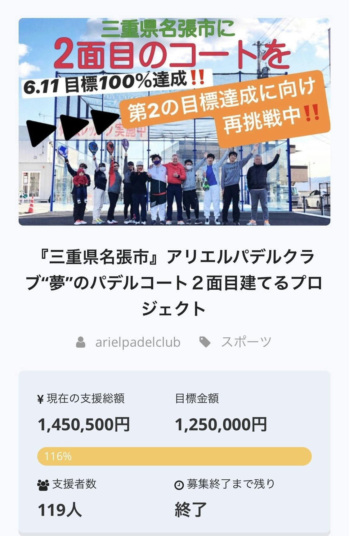『三重県名張市』アリエルパデルクラブ“夢”のパデルコート2面目建てるプロジェクト