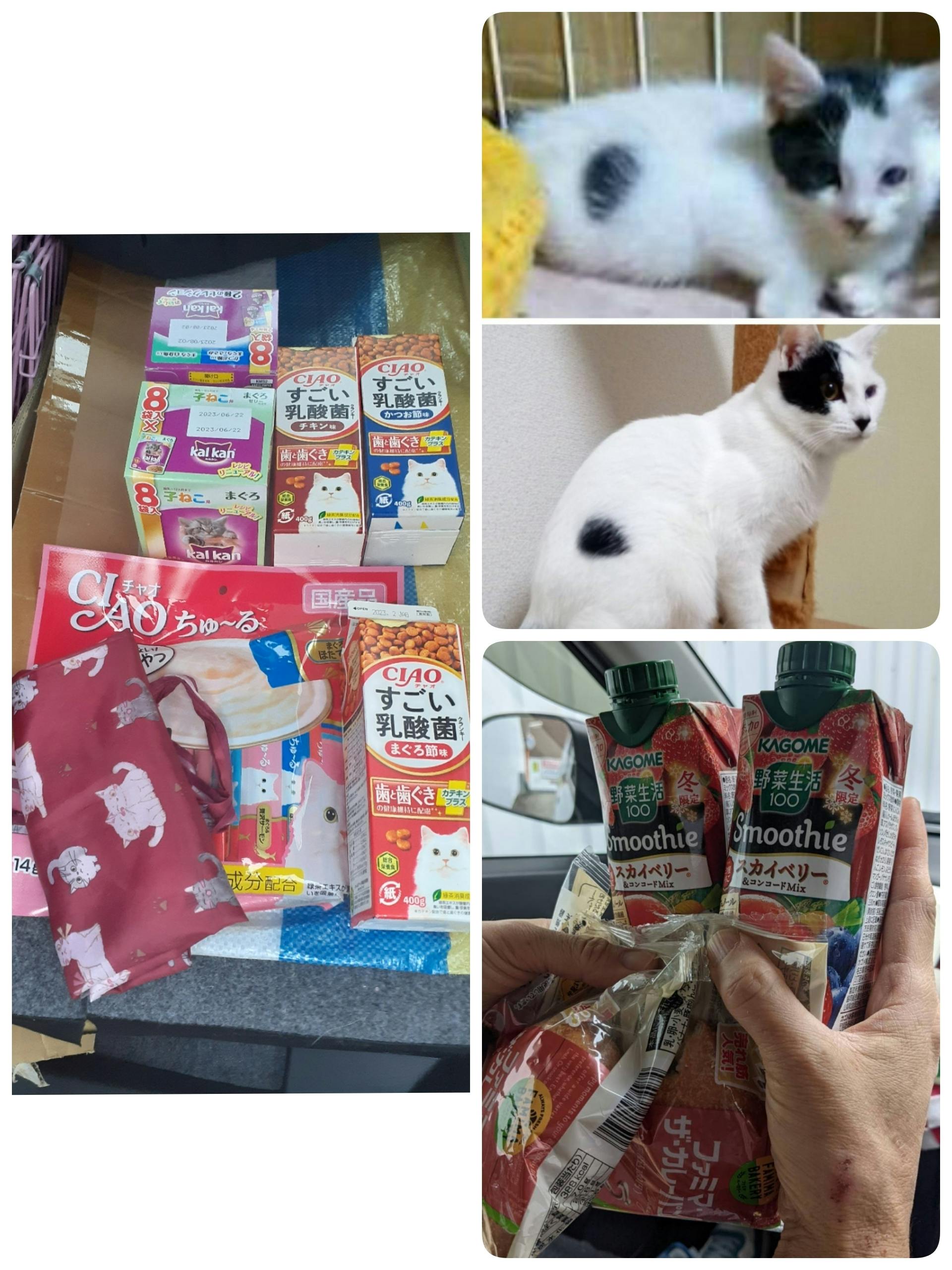 京都府にお住まいのM.R様よりご支援物資を頂きました。今日の譲渡会にもお越しくださいました。つばき(翼)くんの里親さまです。出勤前に寒い中