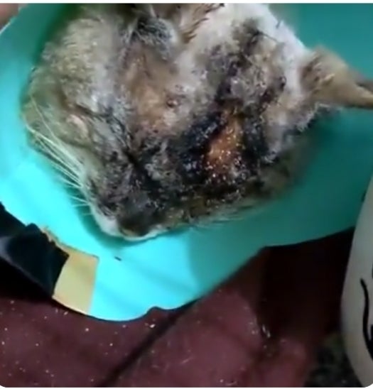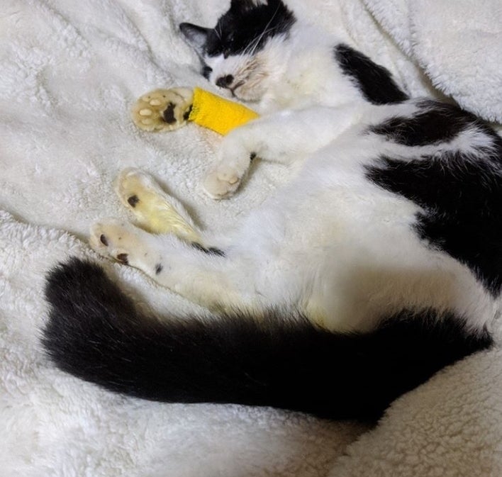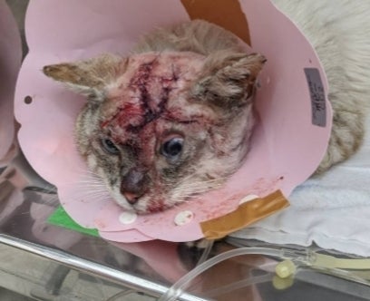 以前は推定6キロ以上の大きな体格でしたが急に痩せて頭部は腐敗臭と動物の爪でえぐられたような傷、首にざっくり切れた跡、脚の肉がみえてました。急いで保護して病院に行きました。