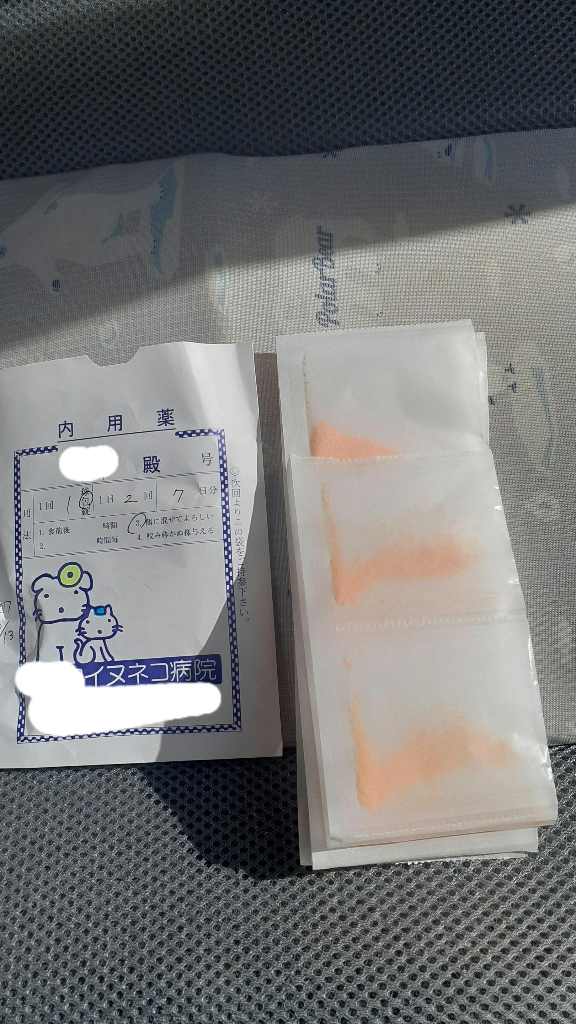 ☆福丸くんに、腕の付け根あたりに噛まれたような傷が見つかり、コンベニア注と飲み薬、付け薬をもらいました。